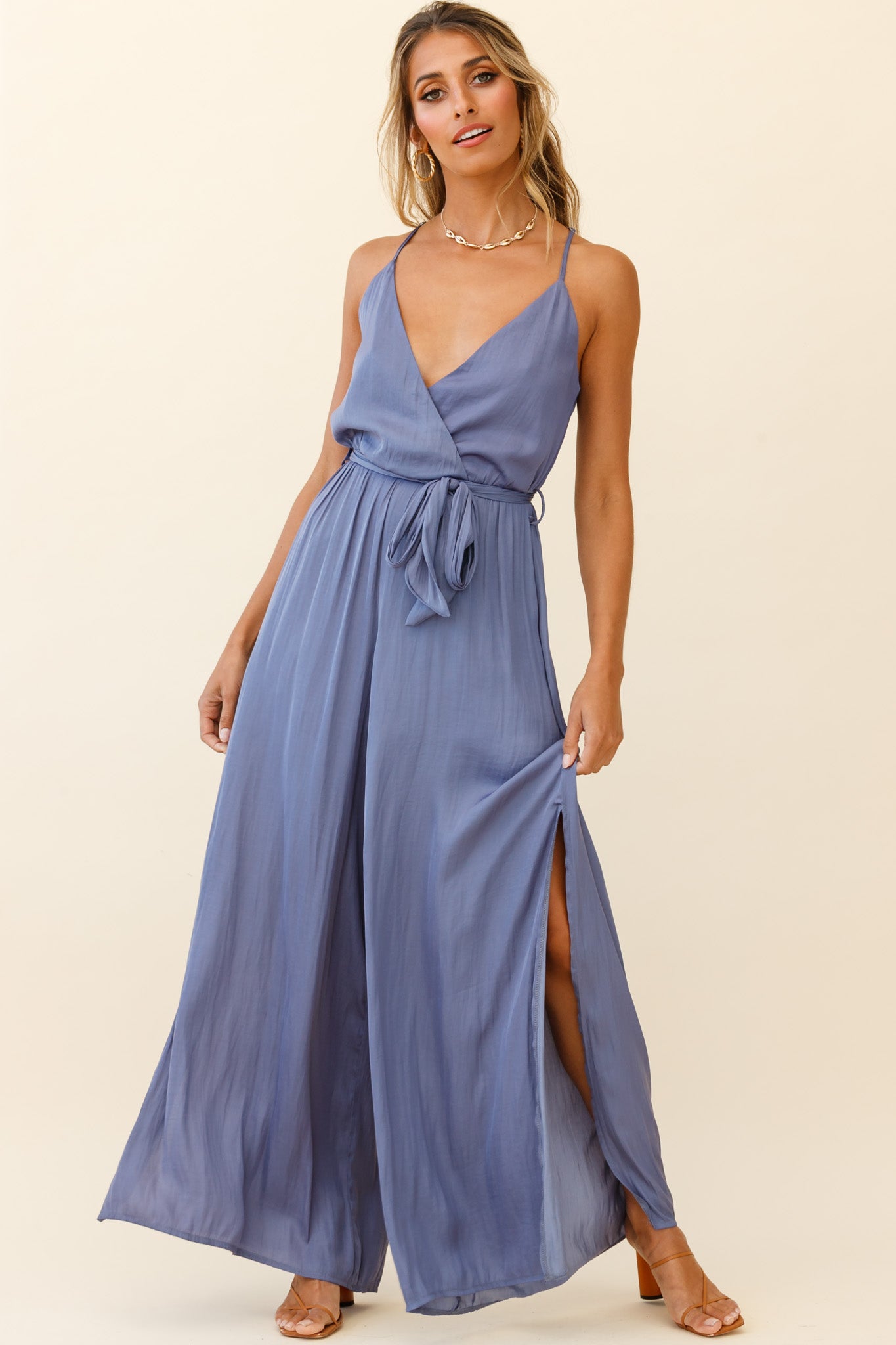 Girl, you'll be making every best-dressed list in our ultra chic Miso jumpsuit. Featuring a super soft fabric throughout, a sexy wrap neckline and hot wide-leg pants with breezy slits up each side, what more could you want? Team it with clear heels and gold hoop earrings for extra style points. Get it, girl!