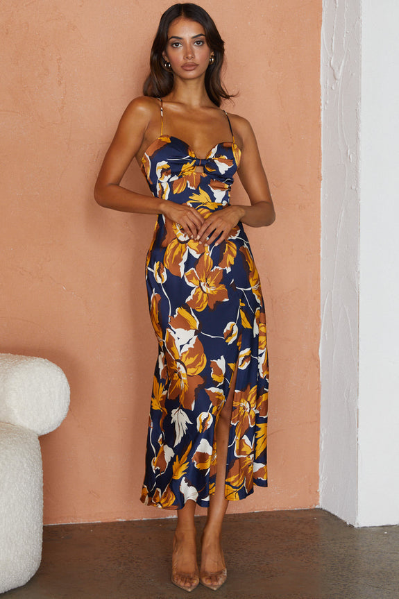 Missoula Cami Strap Padded Bust Midi Dress Floral Print Navy