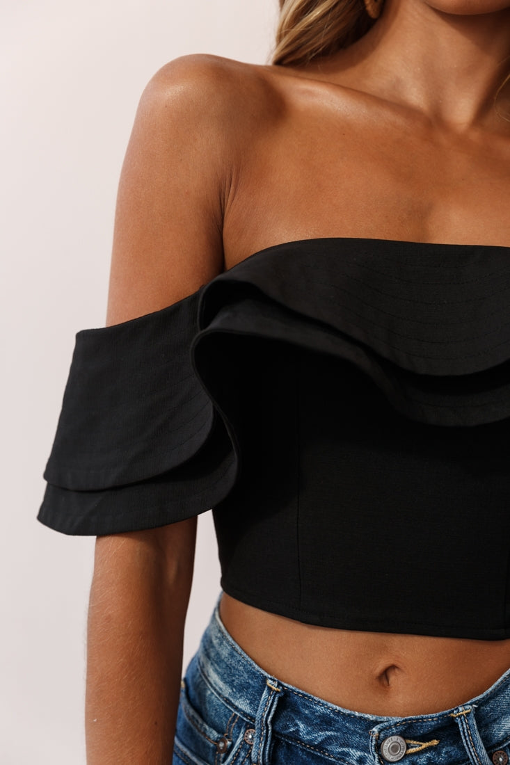 Shoulders are the new cleavage and this Bardot style top is all you need to stay in the style game. Featuring a layered double ruffle, crop length and zip closure at the back. Pair with our Paradise maxi skirt for an ultra classy look or team it with some tailored shorts and wedges and watch heads turn as you strut by.