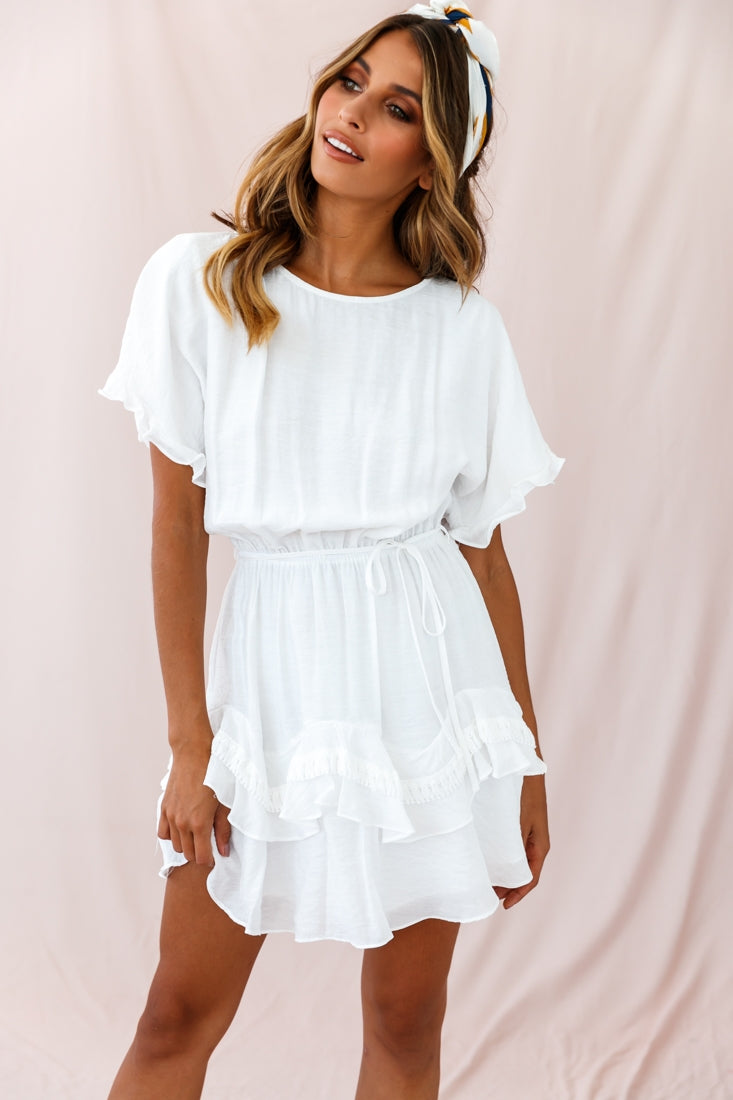 Turn heads in our super cute Mollina dress. Partially lined, it features an elasticated waist with drawstring, frill-trimmed sleeves, a ruffle and tassel-embellished hemline and button fastening at the back. We are loving the soft, breezy fabric. Perfect for lunch with your gal pals or a movie date! Team it with your favorite sandals or wedges and a tote.