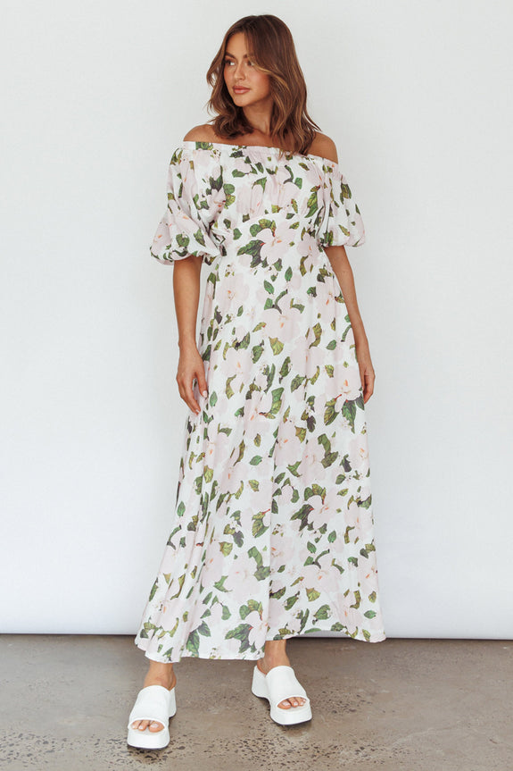 Twirl the day away in our gorgeous Momentum maxi dress. We are in love with its flattering off-shoulder style and puff sleeves. Perfect for weekend lunch dates with your girls. Team it with mules and a tote to complete the look.