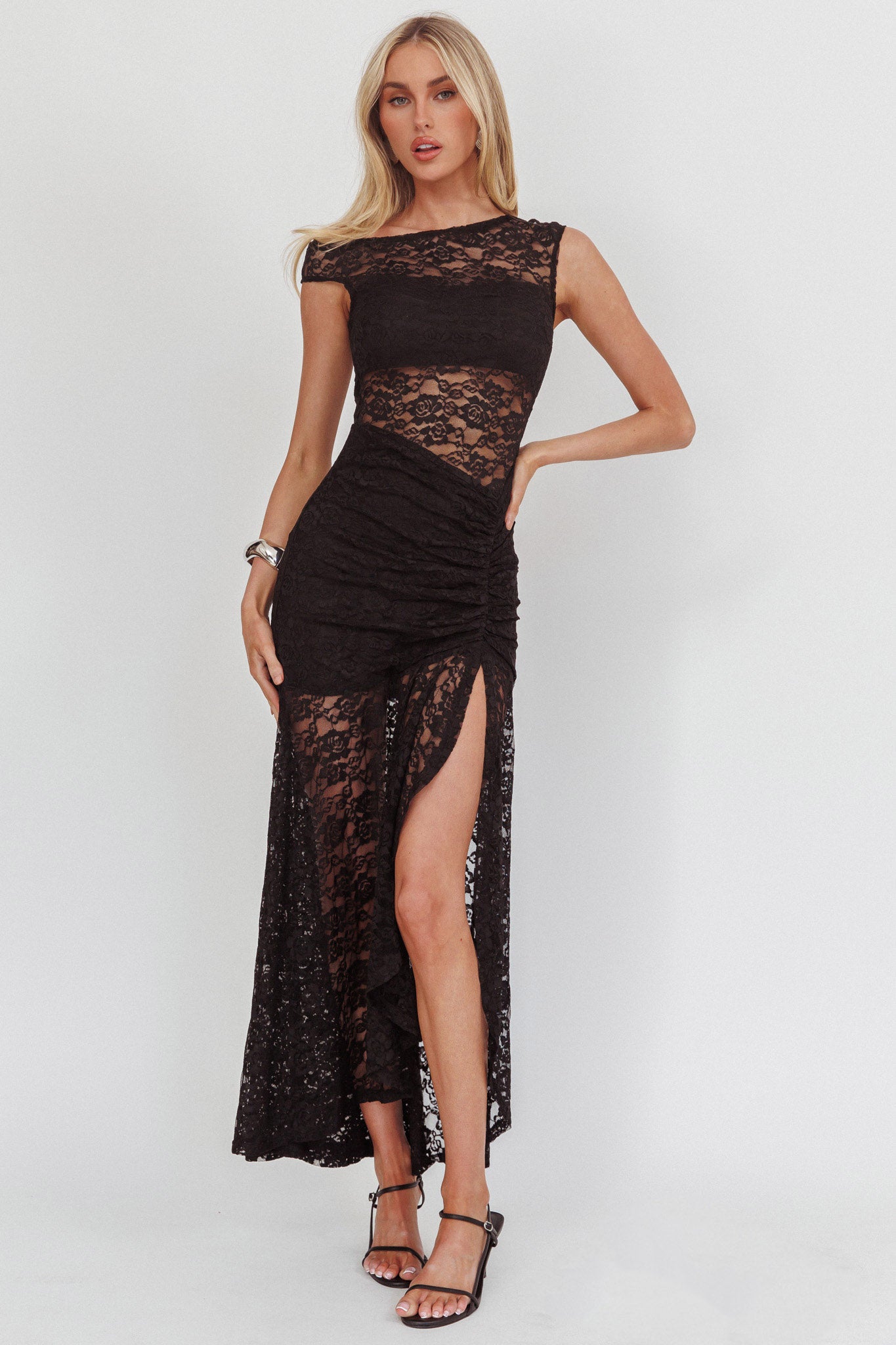 Moonlit Magic Asymmetric Neckline Lace Maxi Dress Black