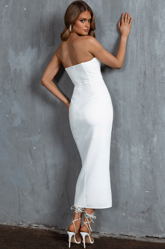 Get ready to turn heads in our gorgeous Mystic dress. Featuring a diamante trim neckline and thigh-high split. it's perfect for bridal events or a work gala. Team it with diamante mules and a clutch for an unforgettable look.