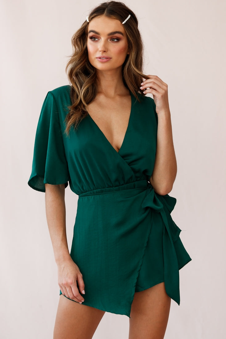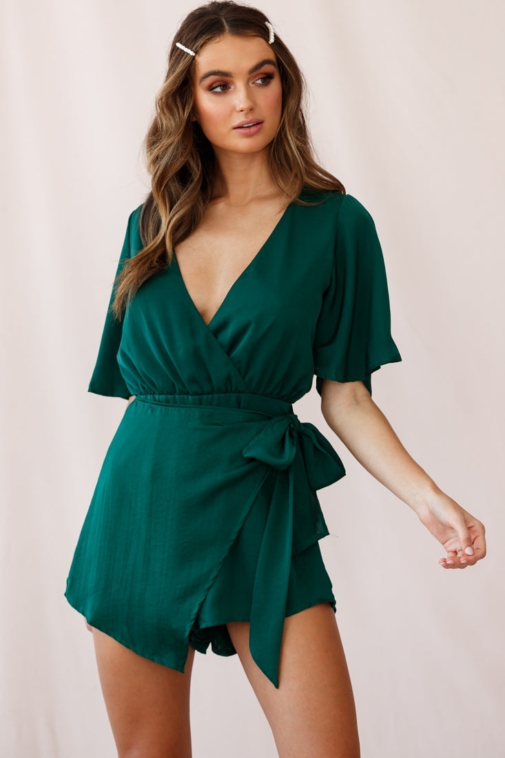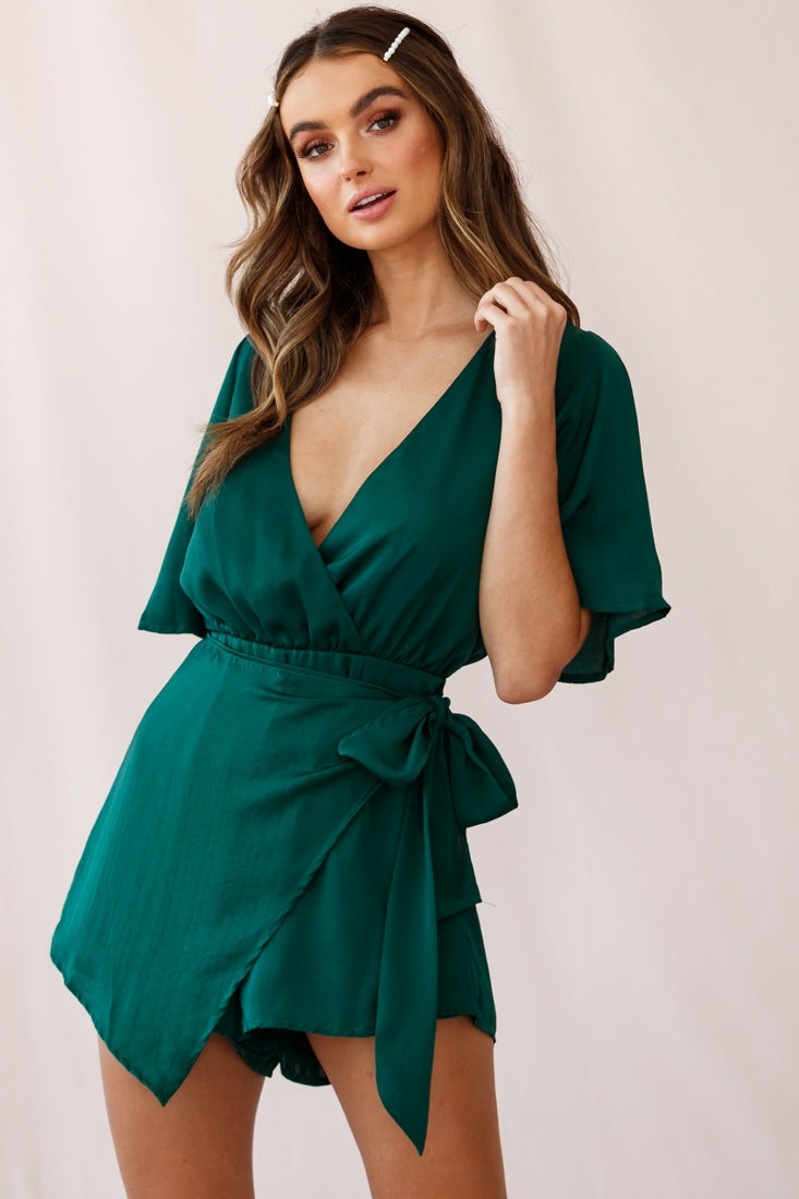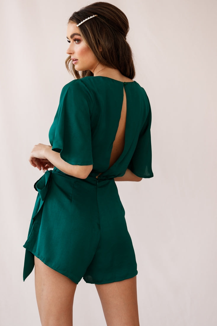 Turn heads in our pretty Nadi romper. Featuring a V-neckline, flared sleeves, keyhole back and flattering wrap style, tying at the side. We are loving the light, silky fabric! Team it with nude heels and statement earrings for a girls' night out!