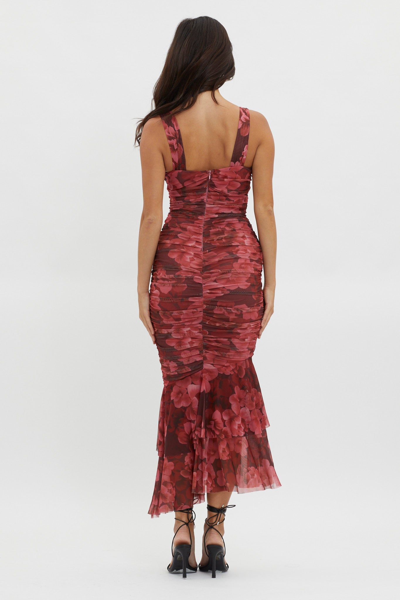 Nadia Ruched Fishtail Midi Dress Floral Wine