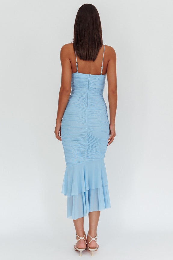 Nadia Ruffle Neckline Ruched Midi Dress Blue