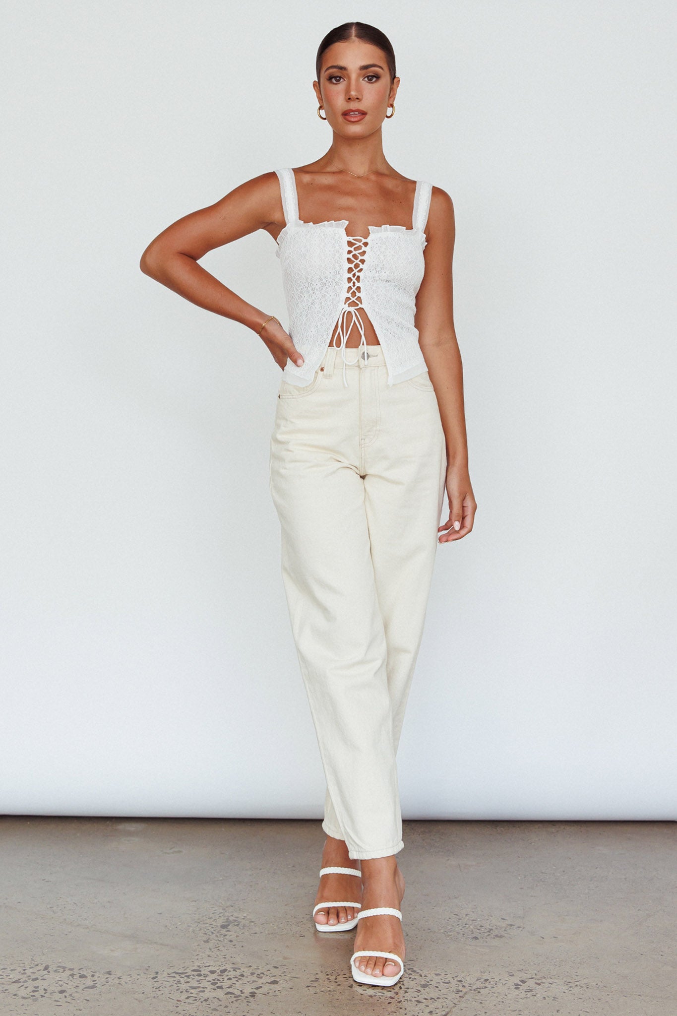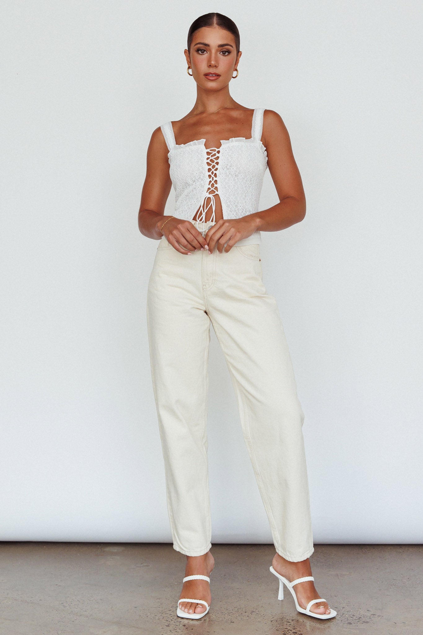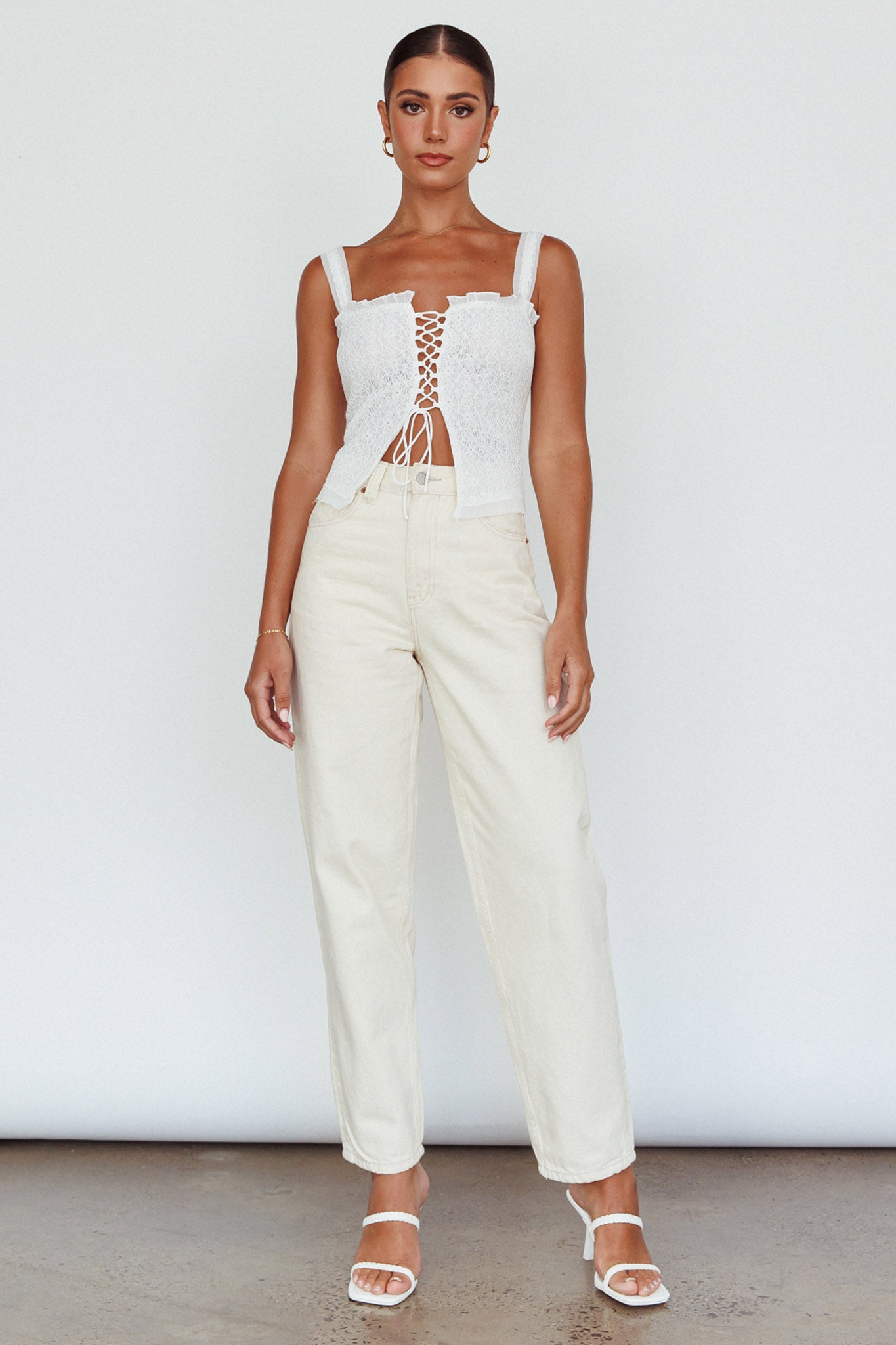 Hey there, cutie! We've fallen head over heels for our adorable Never Miss top. Featuring a lace-up front and frill trim detail. It's perfect for weekend picnic dates with your lover. Team it with shorts and sandals for a cute-casual look.