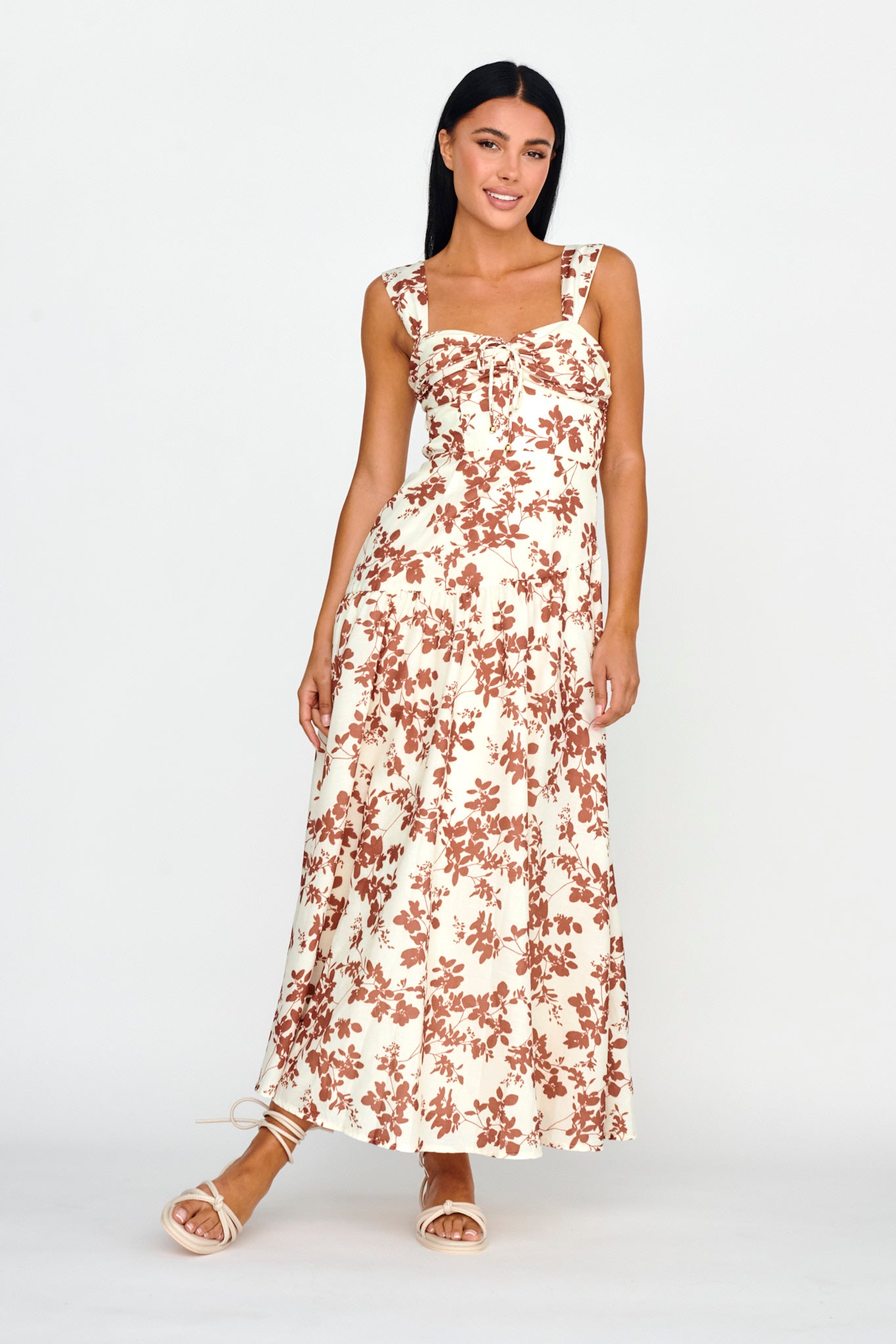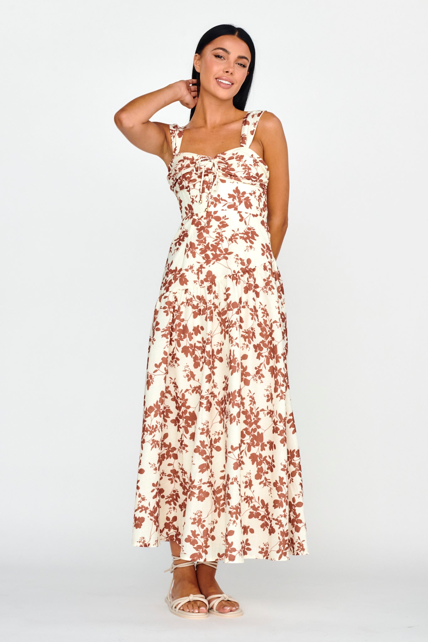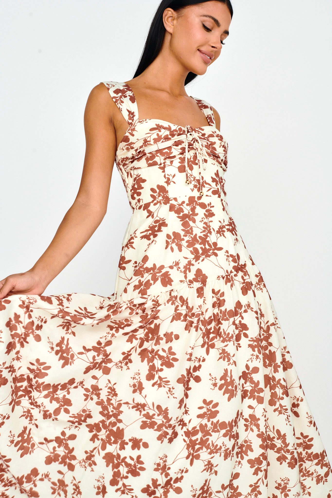 Twirl the day away in our gorgeous Nichola midi dress. Featuring a pretty floral fabric and tie in the bust. It's perfect for a romantic picnic date with your love teamed with sandals and a tote for a super cute look we are loving.