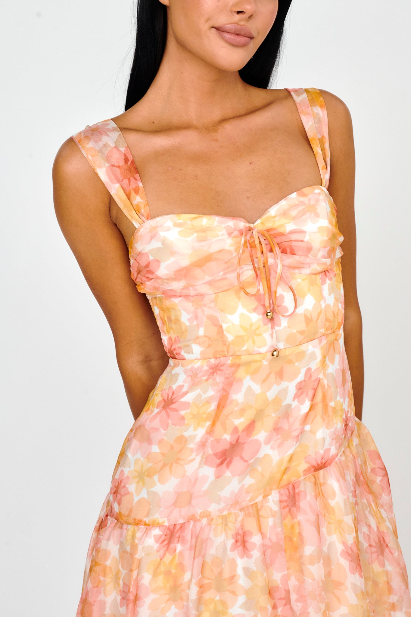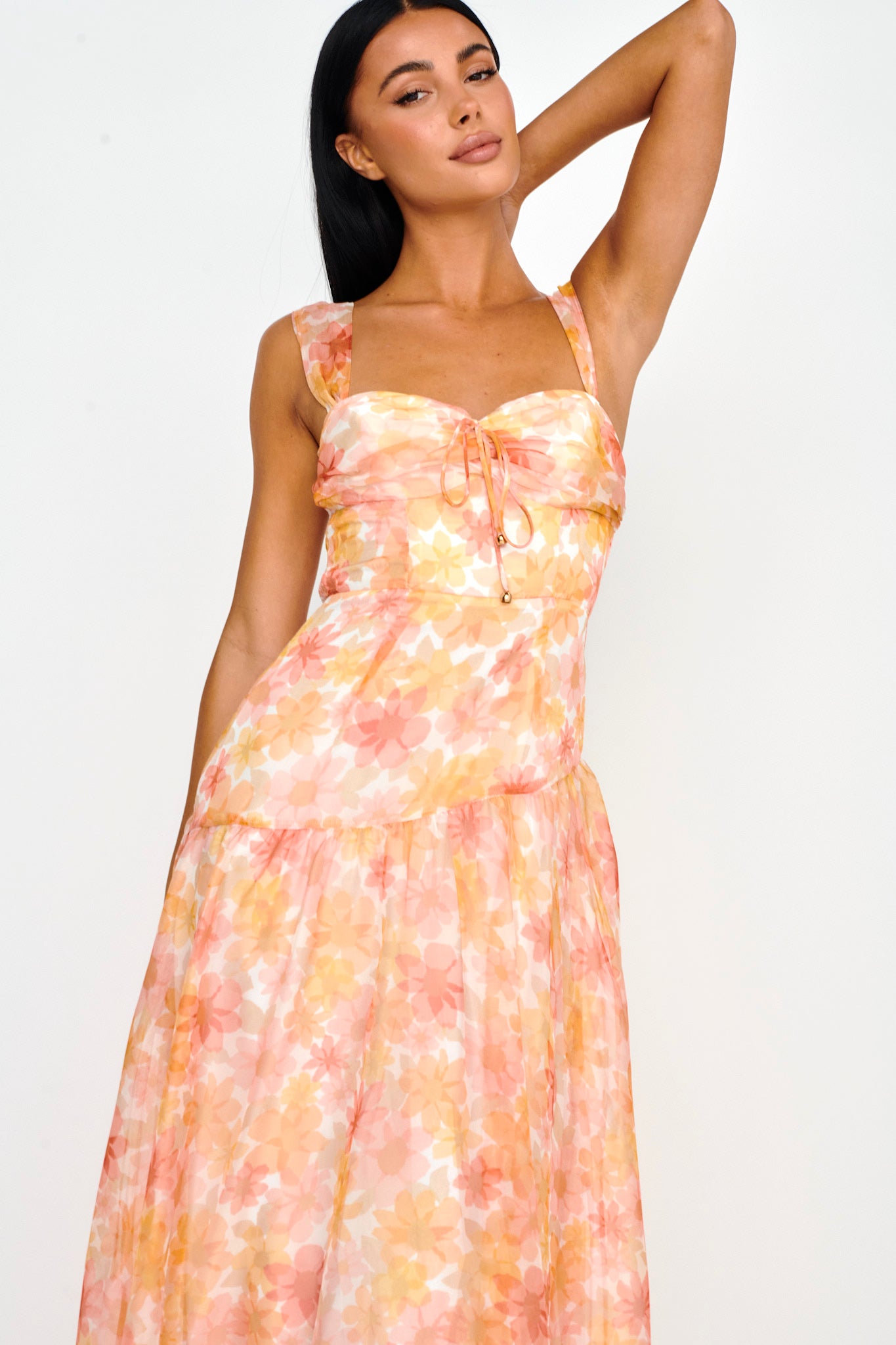 Twirl the day away in our gorgeous Nichola midi dress. Featuring a pretty floral fabric and tie in the bust. It's perfect for a romantic picnic date with your love teamed with sandals and a tote for a super cute look we are loving.