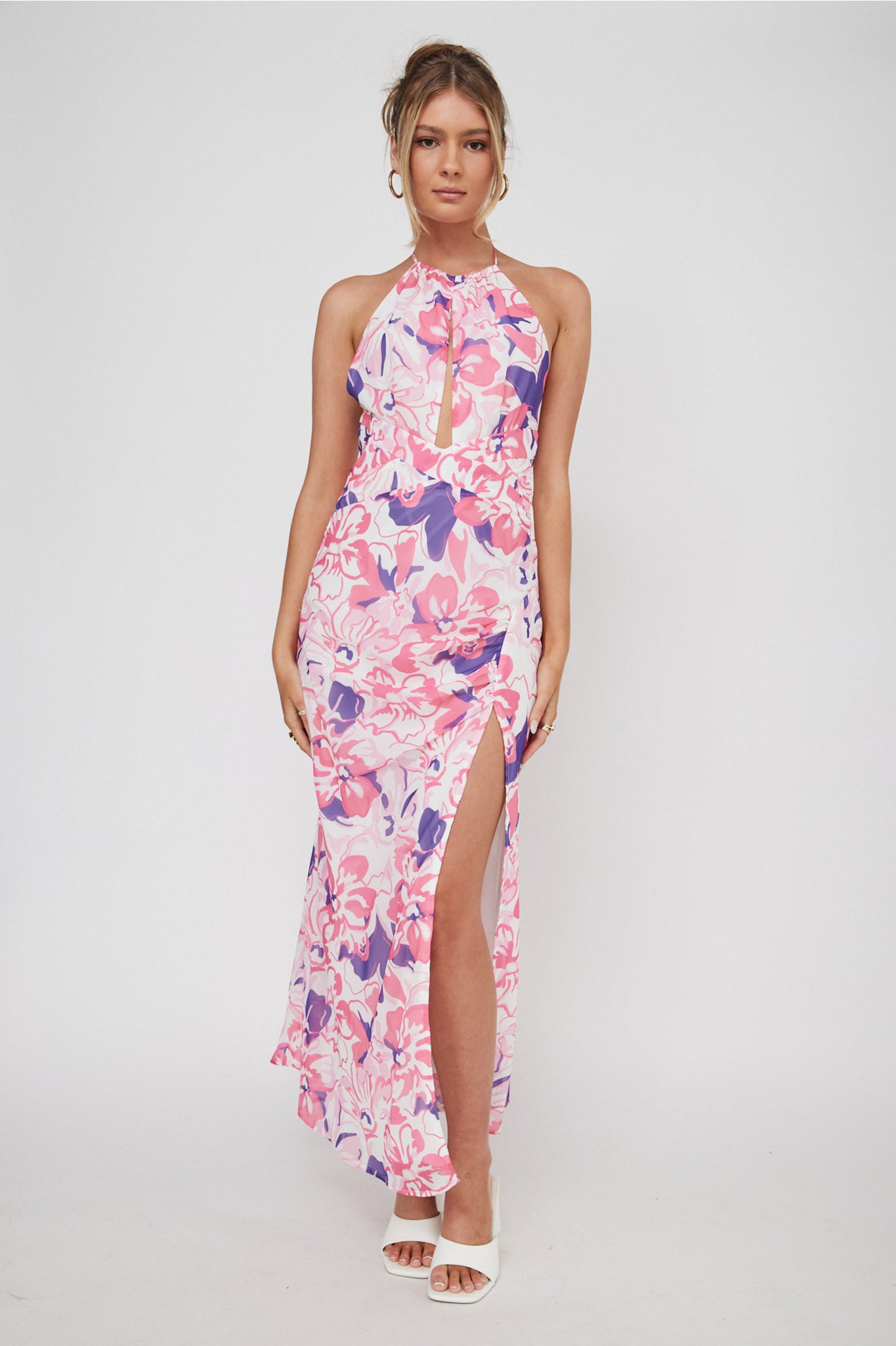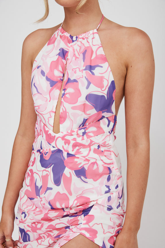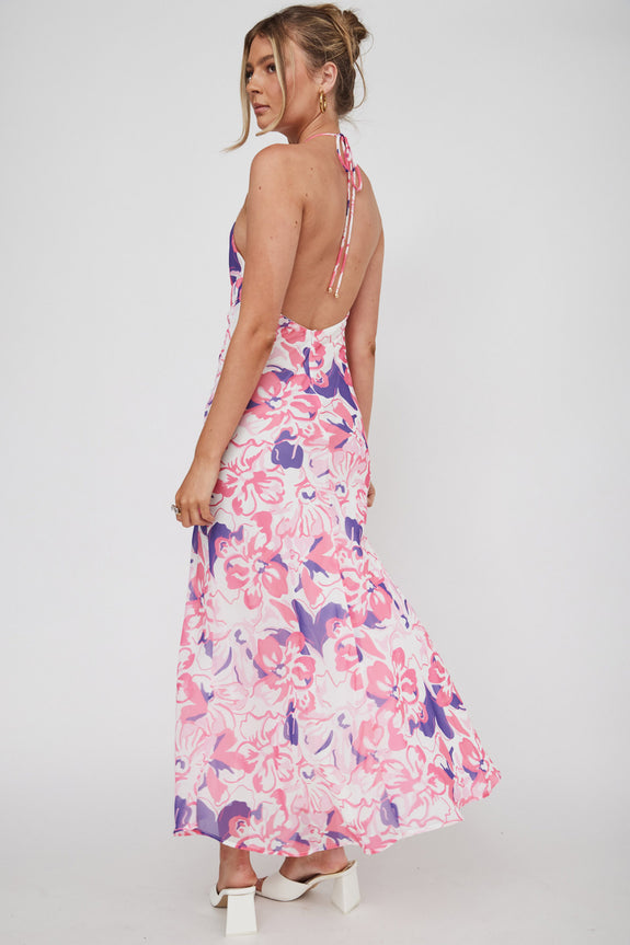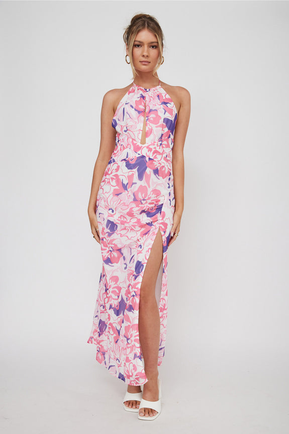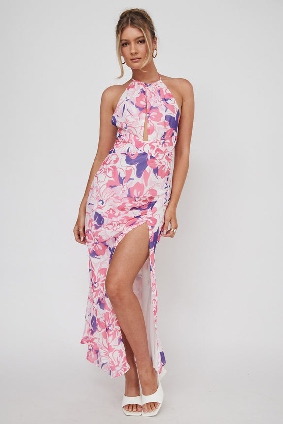 Nirvana Halterneck Split Midi Dress Floral Pink