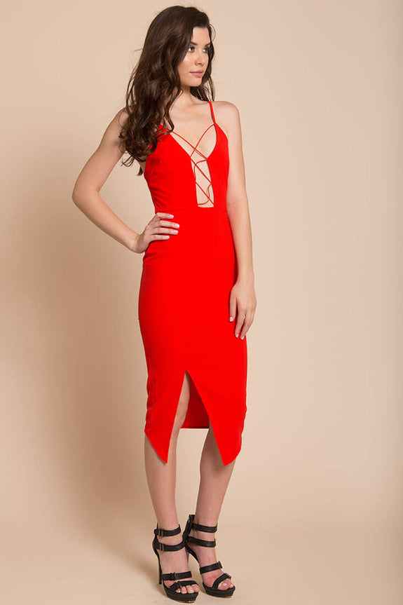 Add a touch of chic to your evening look with this bold figure flattering bodycon. Deep V-front with lace up detail send discretely, sexy signals. Pair with your favorite pair of heels.