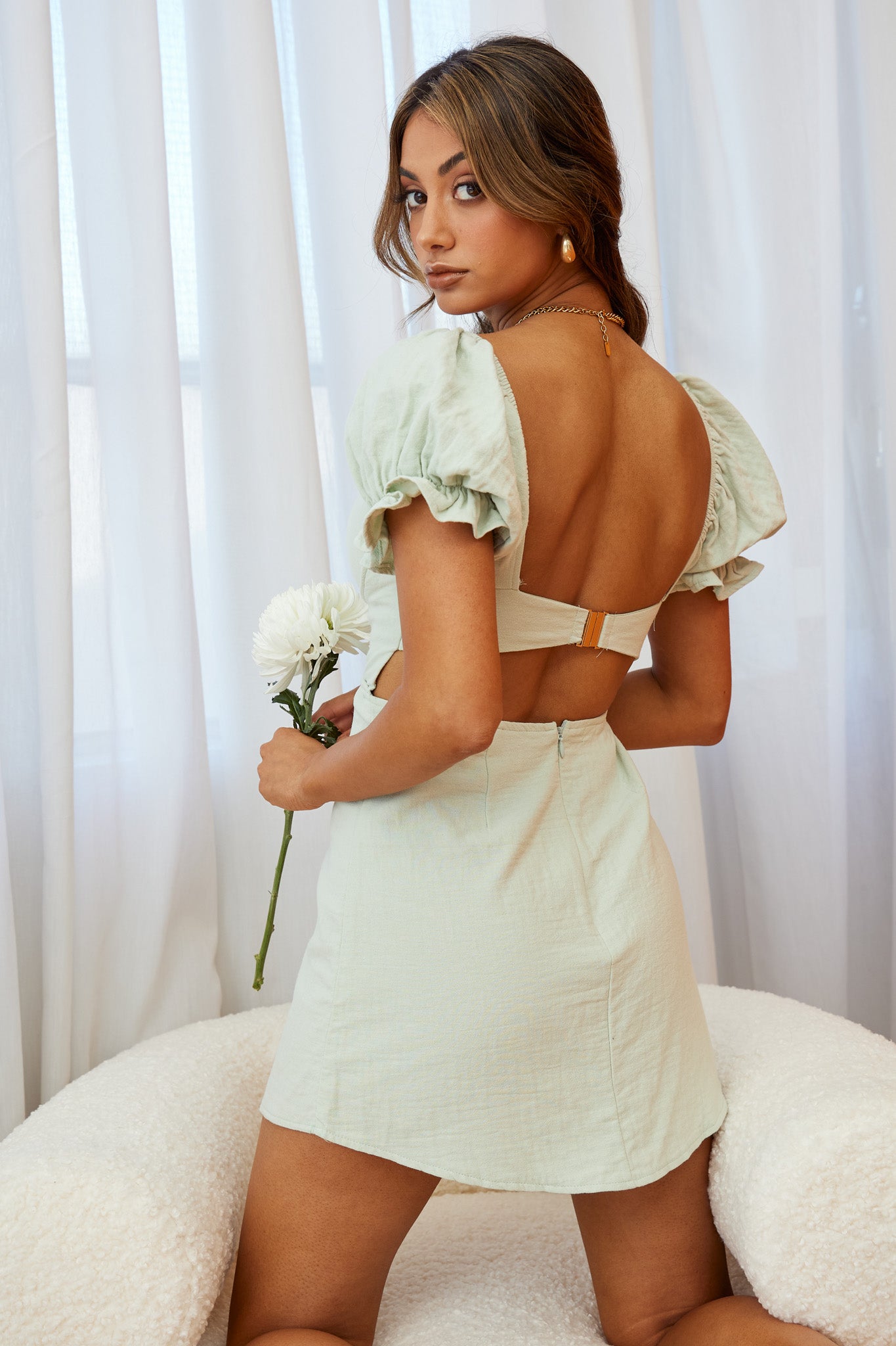 Norma Jean Puff Sleeve Piping Trim Mini Dress Sage