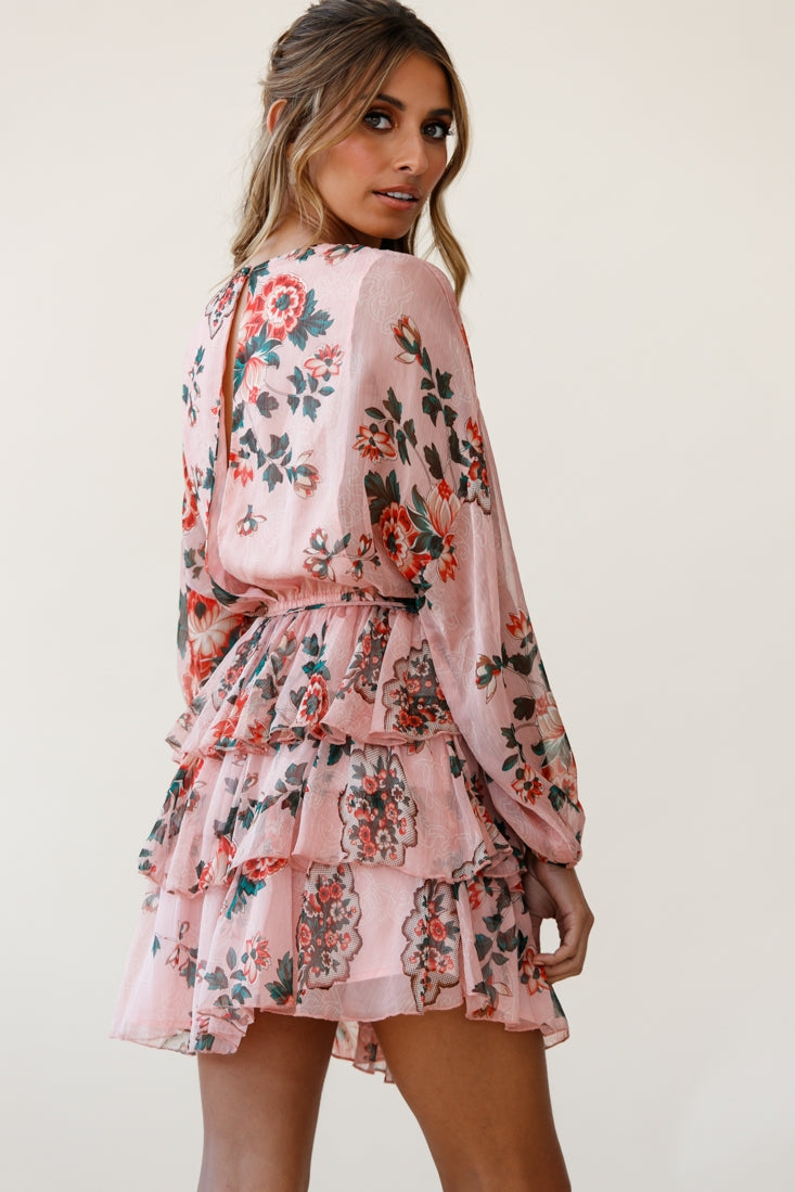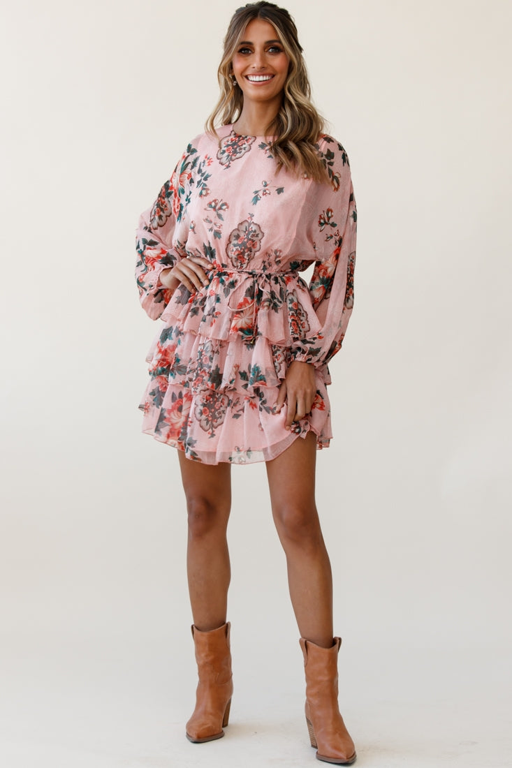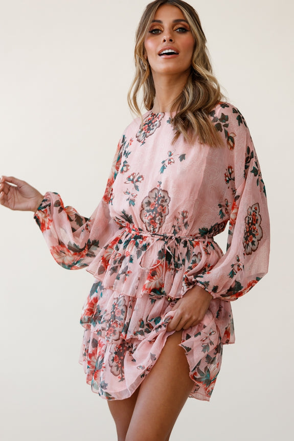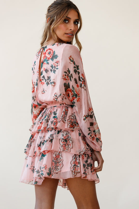 Odessa Long Sleeve Layered Ruffle Dress Floral Print Pink