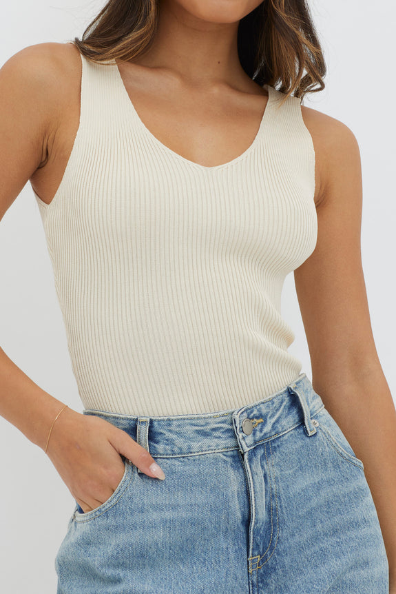 Off-Duty V-Neck Ribbed Knit Top Cream