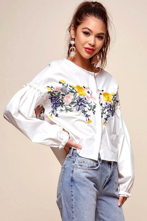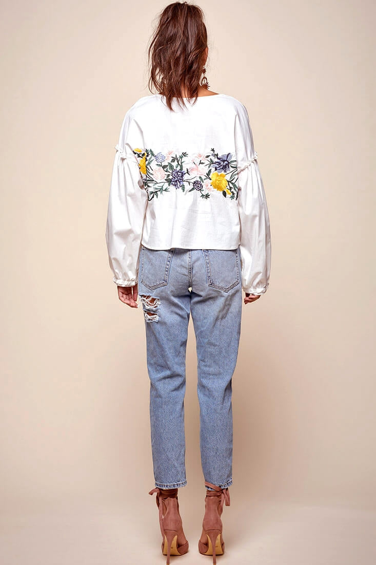 This Iberian-inspired top is a gorgeous addition to any wardrobe. Floral embroidery dance along the center of this flared out top. Pair with light colored jeans and a bold lip.