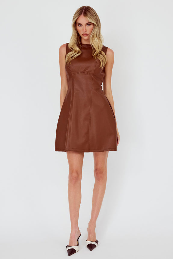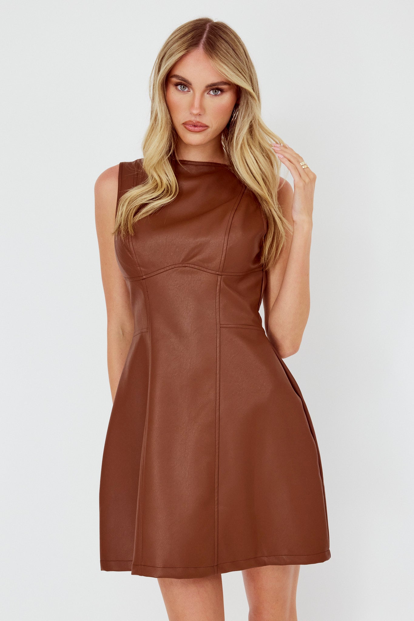 Opulent Sleeveless A-Line Mini Dress Faux Leather Brown