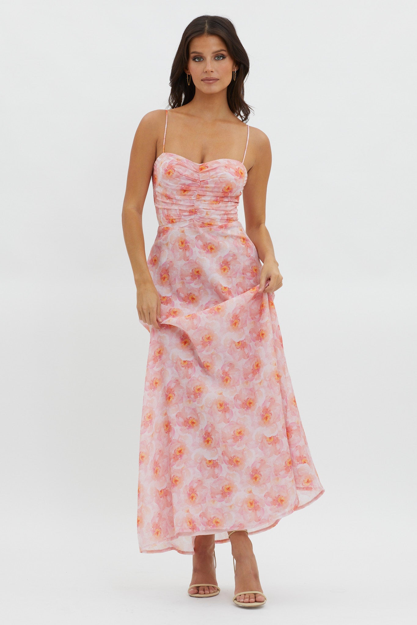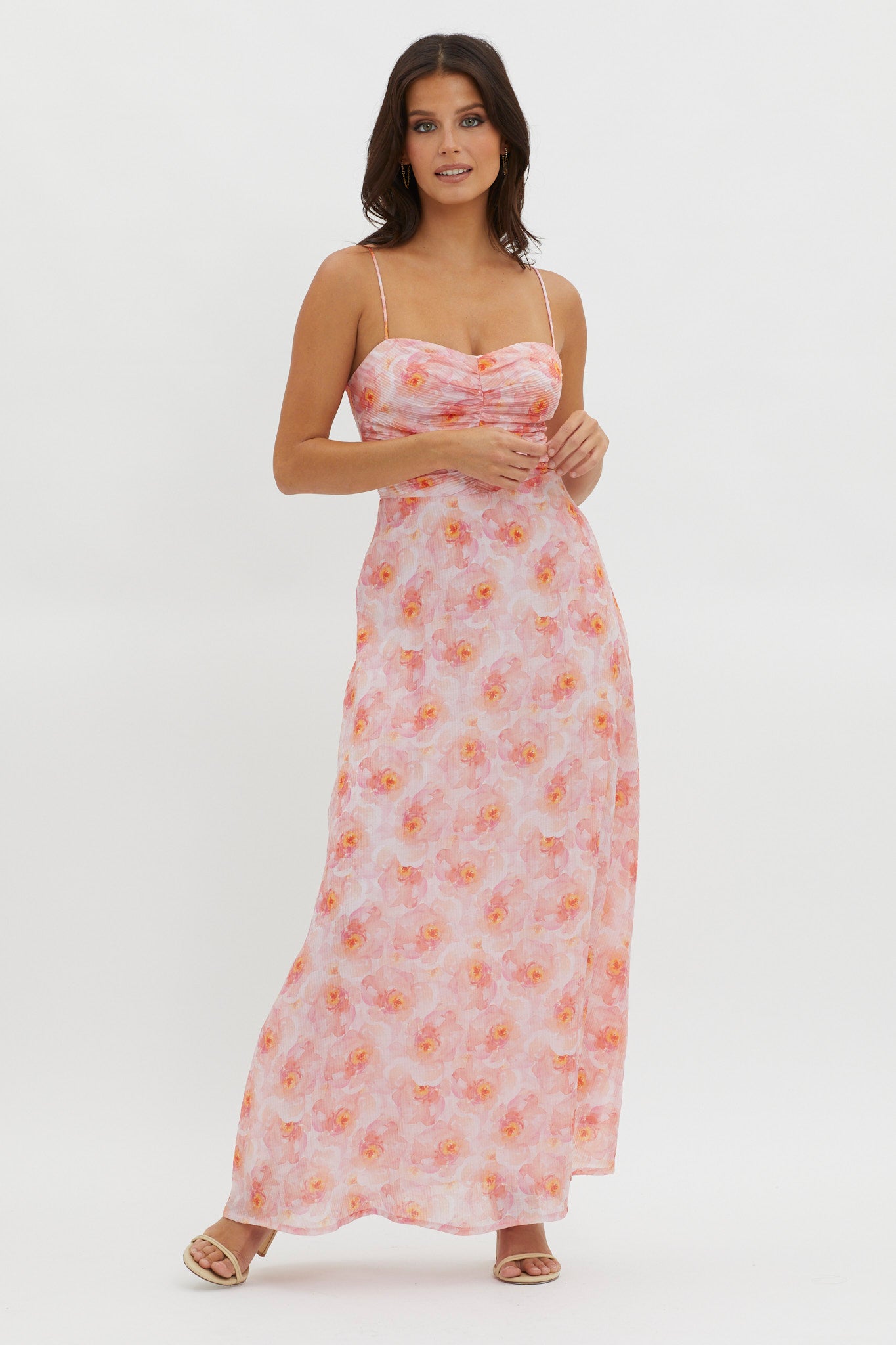 Hello, gorgeous! You will feel like a princess in our pretty Our Song maxi dress. Featuring a gorgeous floral print and ruching detail in the bodice. It's perfect for a wedding or birthday brunch. Team it with nude heels and a saddle bag for an elegant look.