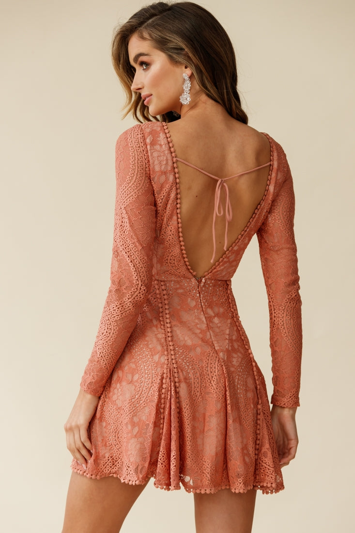 Make a statement in our gorgeous Palm Springs dress. Fully lined, it features the prettiest lace overlay with circle trim detail throughout, low back with string tie, A-line skirt and fluted hem. Perfect for dinner and cocktails with your bffs teamed with ankle booties and gold hoop earrings.
