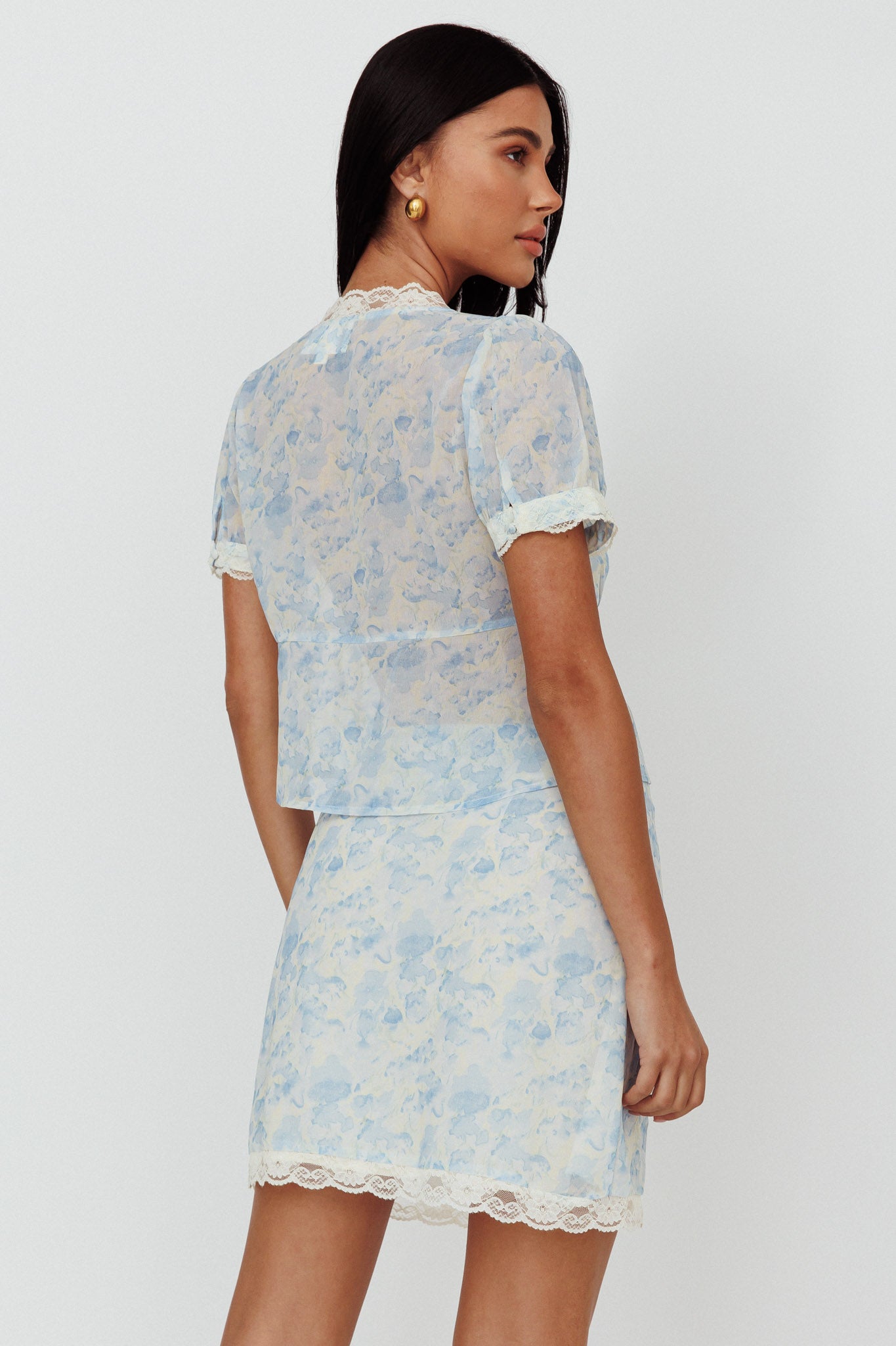 You'll feel like you're floating on Cloud 9 in our super sweet Palmer top. Featuring a delicate lace trim and a feminine print, it's perfect for romantic dates with your lover. Team it with its matching mini skirt and pointed-toe kitten heels for a dreamy look we are head over heels for!