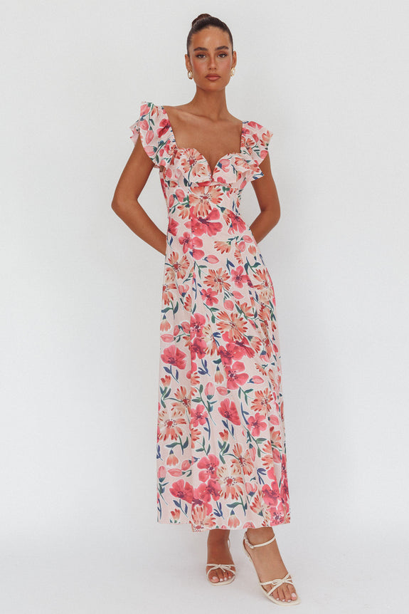 Palms Ruffle Sleeve Tied Back Maxi Dress Floral Pink