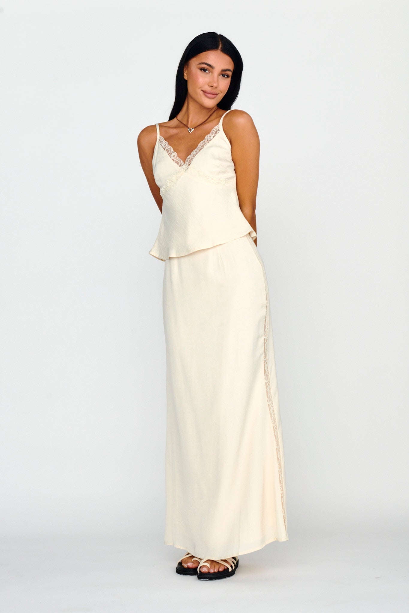 Turn heads in our pretty Pammy top. We are in love with the delicate lace trim detail. Perfect for Friday dinner with your girls. Team it with its matching maxi skirt and mules for an It Girl look we are loving.