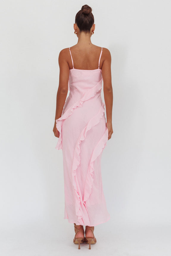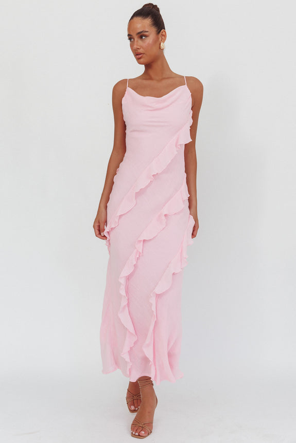 Panama Bay Ruffle Trim Cowl Neck Maxi Dress Pink