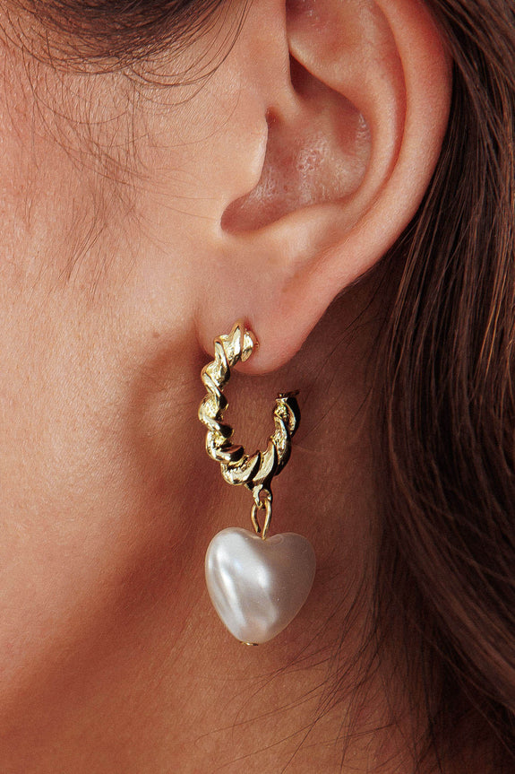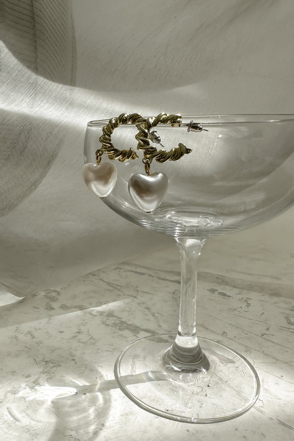 Elevate your look with our stunning Paris earrings. We are head over heels for their pearly, puffed heart and twist detail in the hoops. Perfect for a birthday party or a special occasion. This will go perfectly with our Smitten mini dress or a feminine, satin midi skirt and corset top!