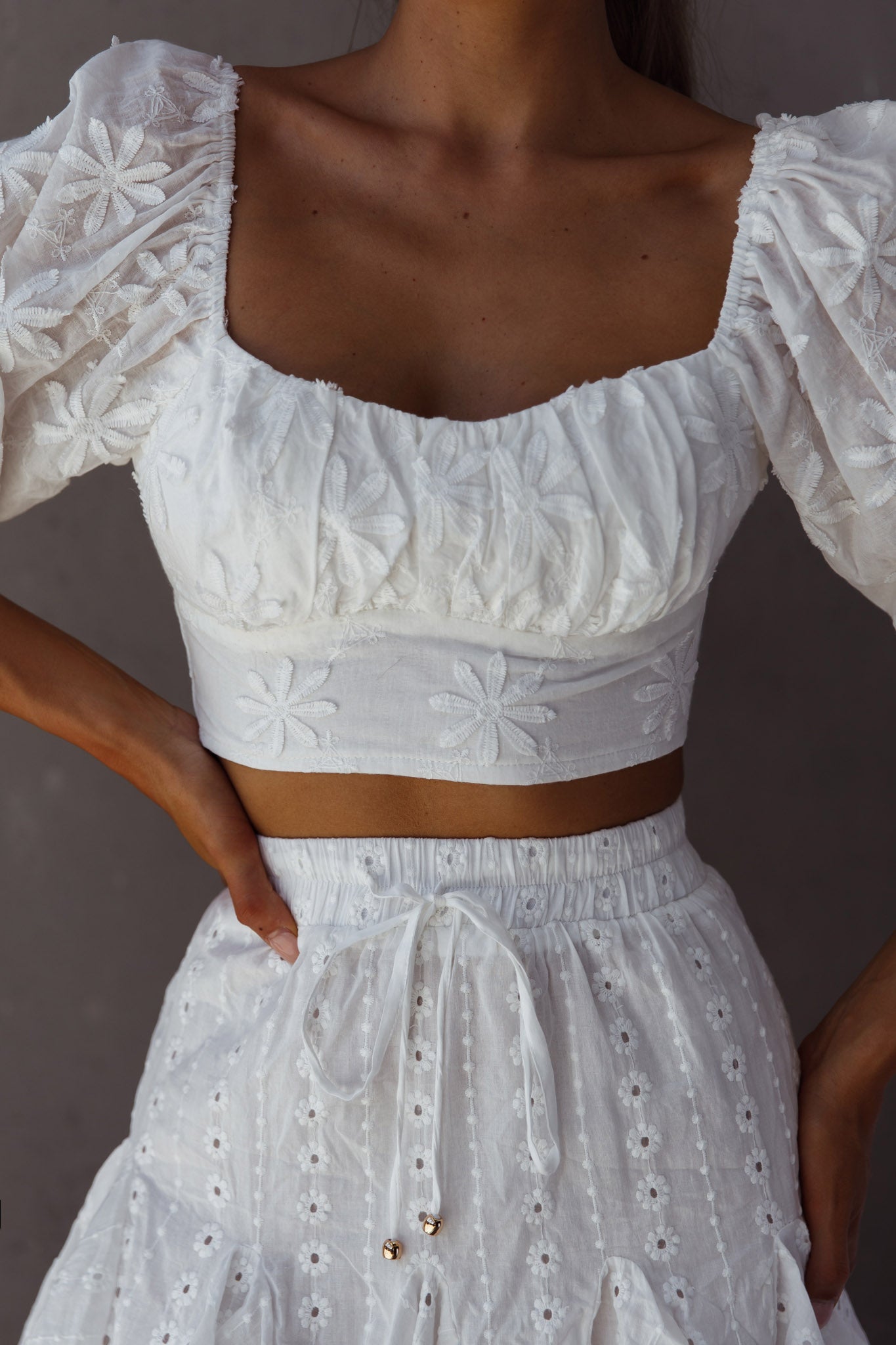 Hello, gorgeous! You will leave a lasting impression in our super cute Passing By crop top. Featuring a ruched bust and puff sleeves. Perfect for a bridal shower or birthday celebration. Team it with nude heels and our Robyn skirt for a super cute look.