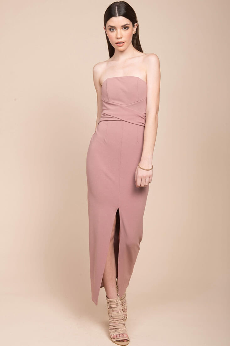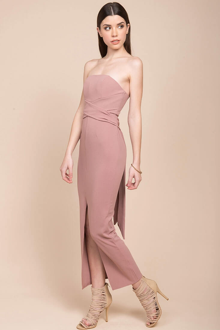 Who said midi wasn't sexy? Tasteful, strapless bodycon with high slits make for the classic dress of your dreams. Wear this dress with sleek heels and drop earrings.