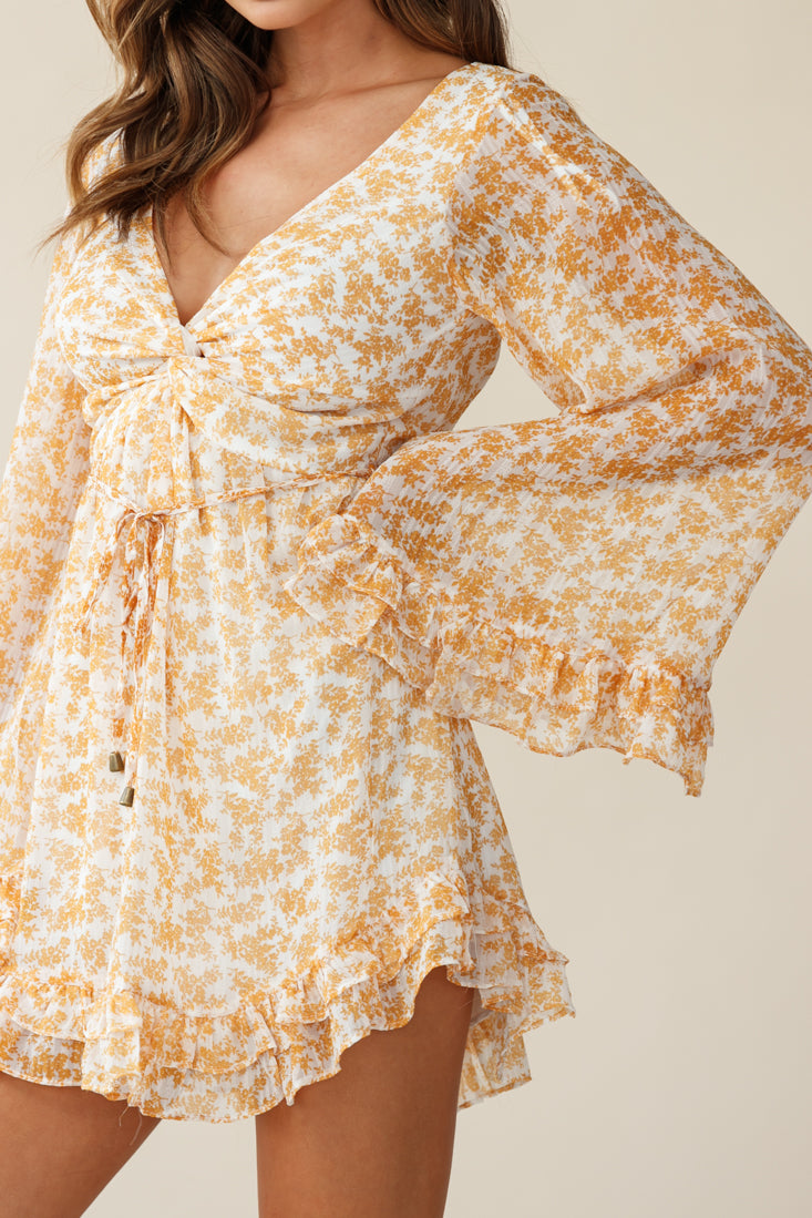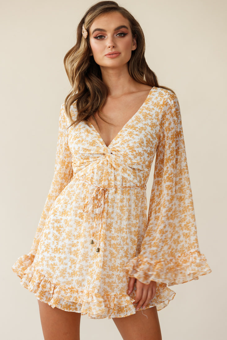 Channel your inner 70's babe with our pretty Perri dress. We are all about those bell sleeves twisted knot bust detail in the front. You'll feel like rounding up the squad for a night out, dancing 'til dawn. Team it with knee-high boots for a super cute look.