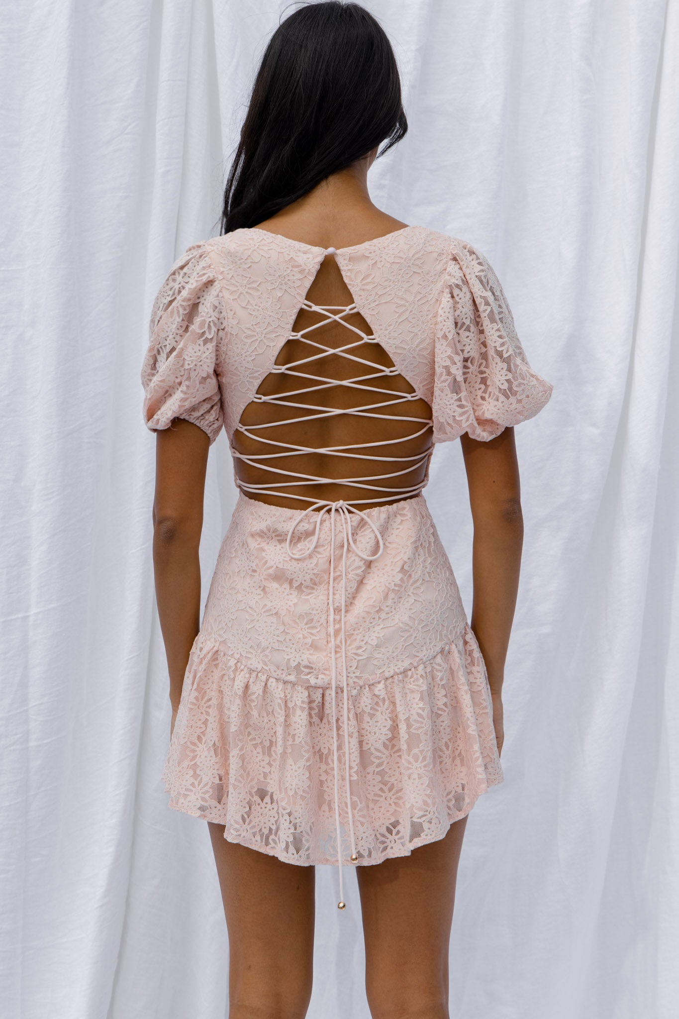 Petite Cherie Puff Sleeve Lace-Up Back Dress Lace Blush
