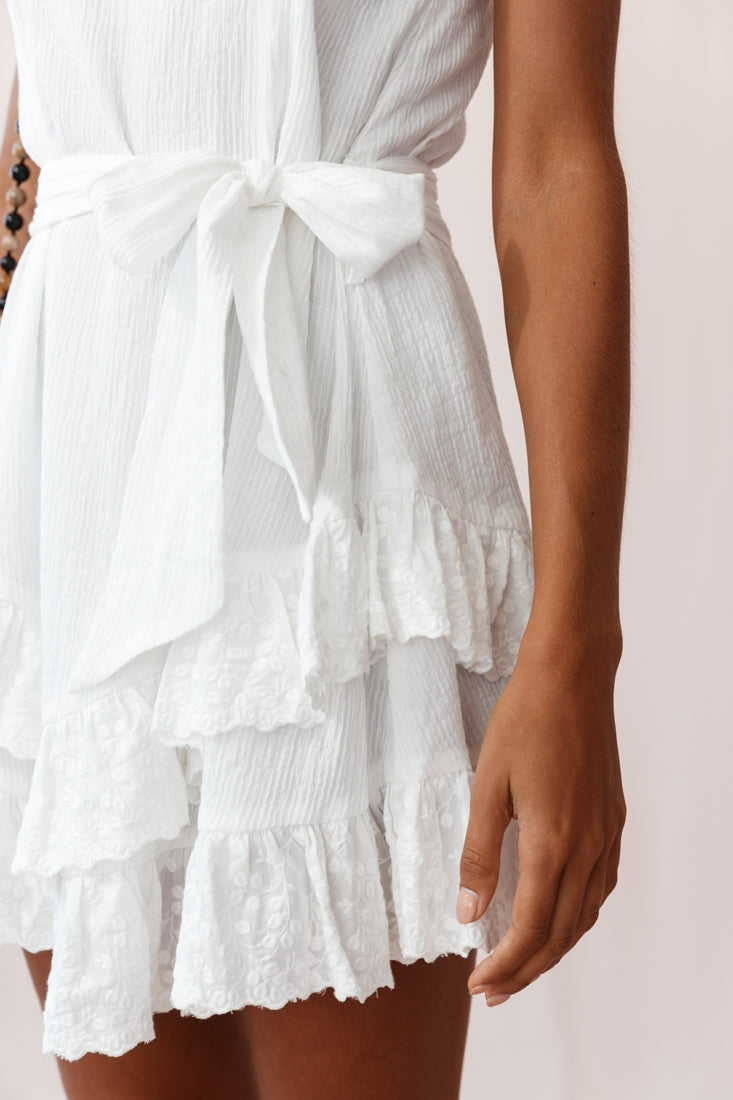 Hey there, cutie! You are stealing the show in our super cute Petrie dress. Fully lined, it features a double, layered ruffle hemline, adjustable cami straps, separate waist tie and invisible zipper up the back. Perfect for a girls' day out teamed with tennis shoes and a woven circle bag.
