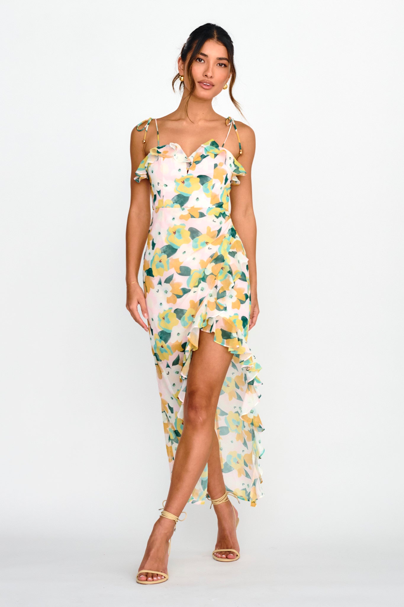Steal the spotlight in our gorgeous Portofino dress. Featuring tied shoulders and an open split with ruffle trim. It's perfect for your big birthday celebration! Team it with white, strappy heels and a clutch for a look that will turn heads.
