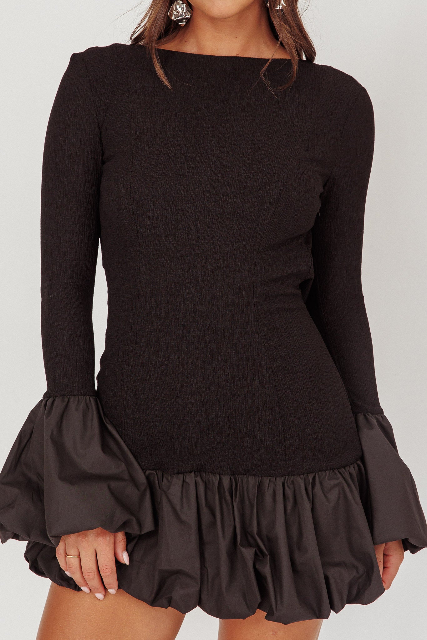 Jaws will drop when you walk in wearing our Promise mini dress. It features a bubble hem and cuffs, not to mention that sexy, open back! It's perfect for a birthday celebration or special event. Team it with strappy, black heels and a clutch for an unforgettable look.