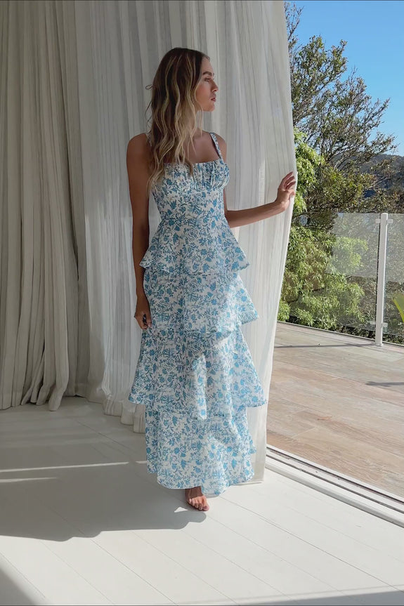 Provence Bloom Tiered Midi Dress Floral Blue