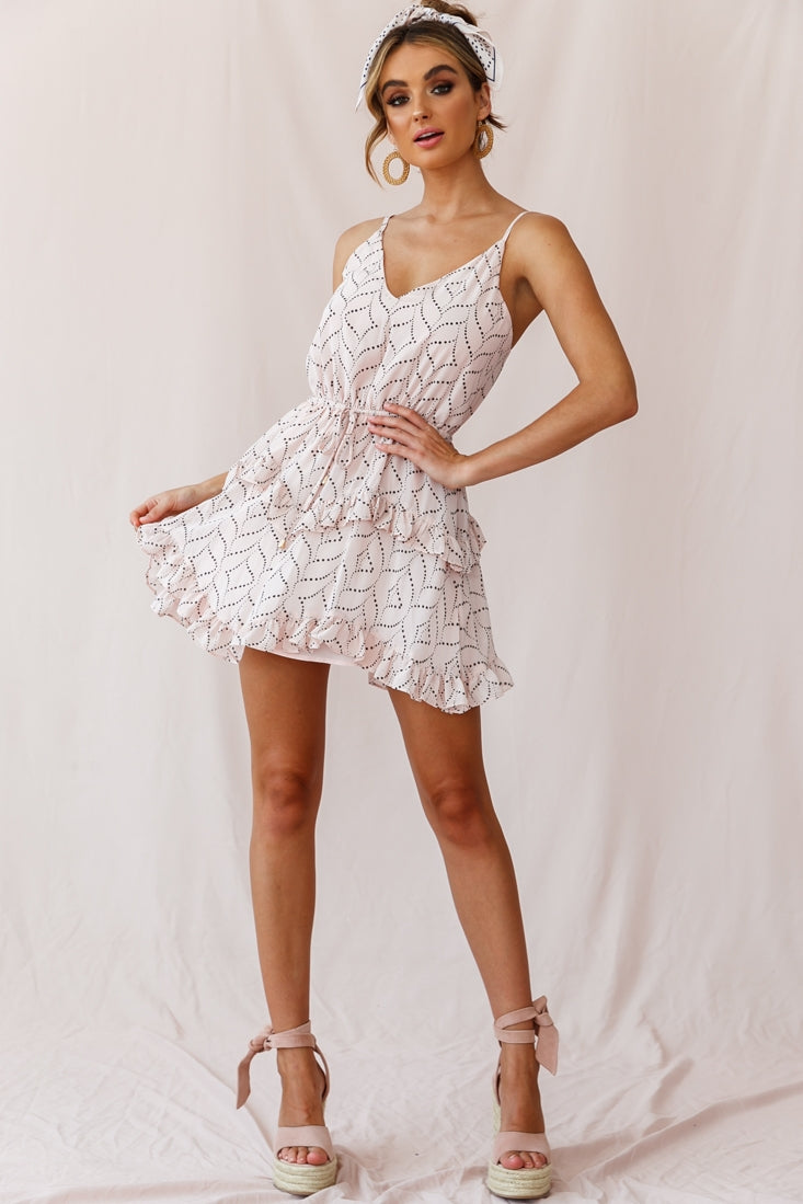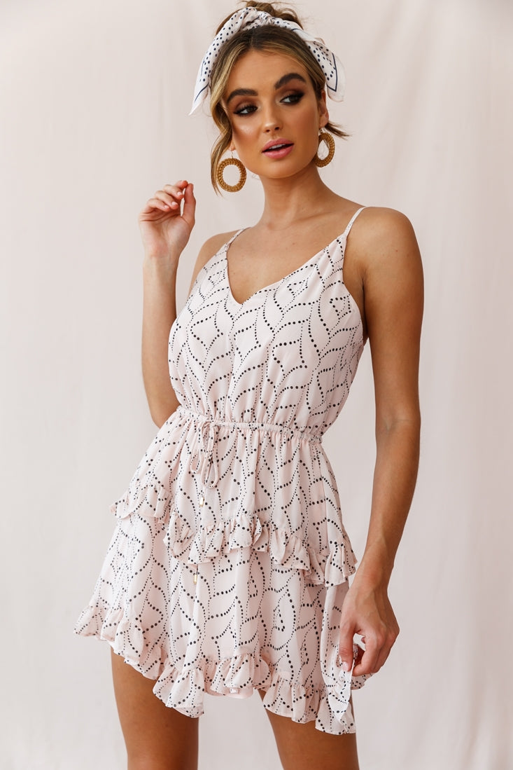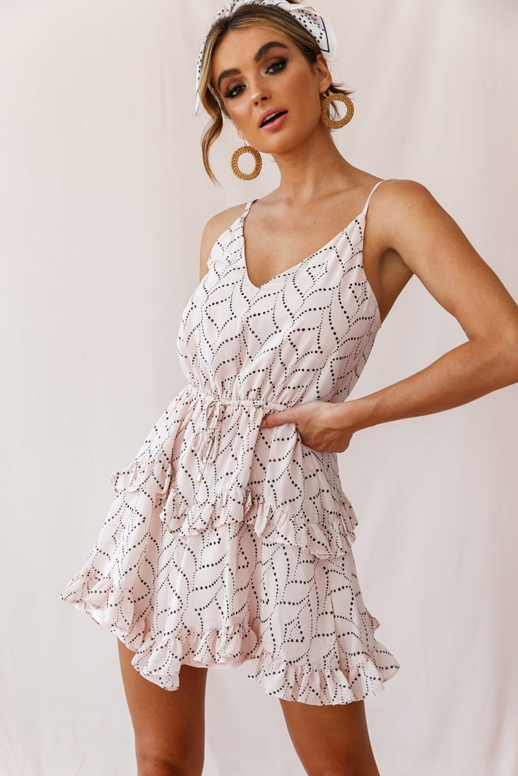 You're a real cutie in our --- dress. Featuring the sweetest layered frill trim detailing, polka dot print fabric, cami straps and drawstring tie with golden toggles around the waist. Wear it to the mall with your girls or to work teamed with tie-up wedges and layered gold necklaces. Cute!