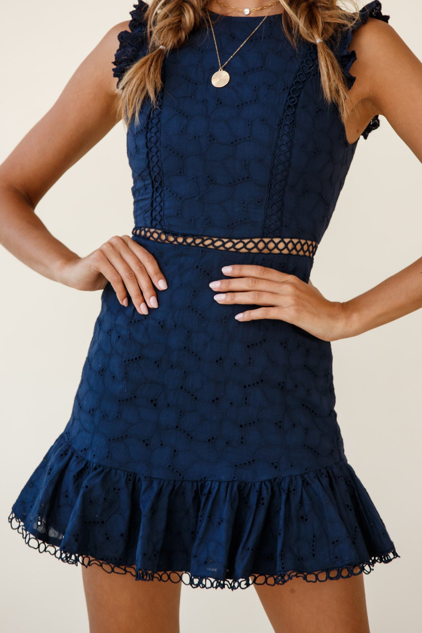 Steal the show in our gorgeous Reaching For Stars dress. Featuring a beautiful anglaise fabric throughout and and a corseted back that has us drooling! Perfect for a flirty date night with your new beau. Team it with strappy nude heels and gold hoop earrings. Yes, girl!