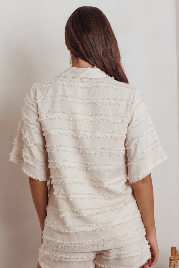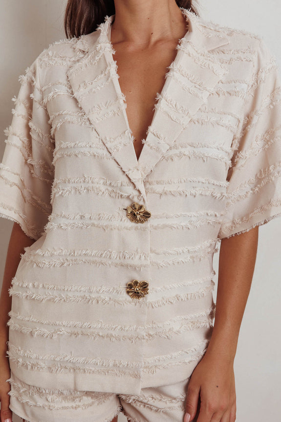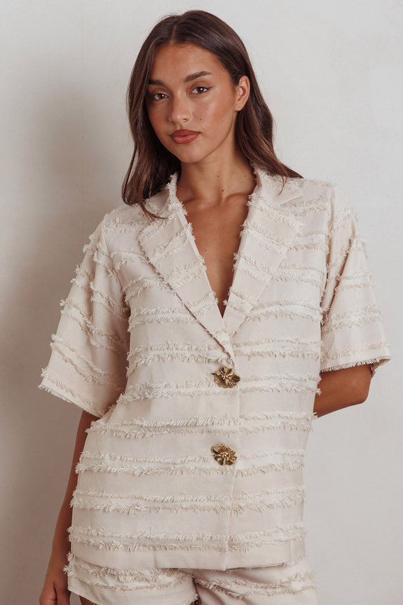Make an entrance in our chic Reed top. It features a pretty raw edge trim and gold statement buttons. It's perfect for weekend brunch dates with your girls. Team it with its matching shorts, sandals and a tote for a sophisticated look.