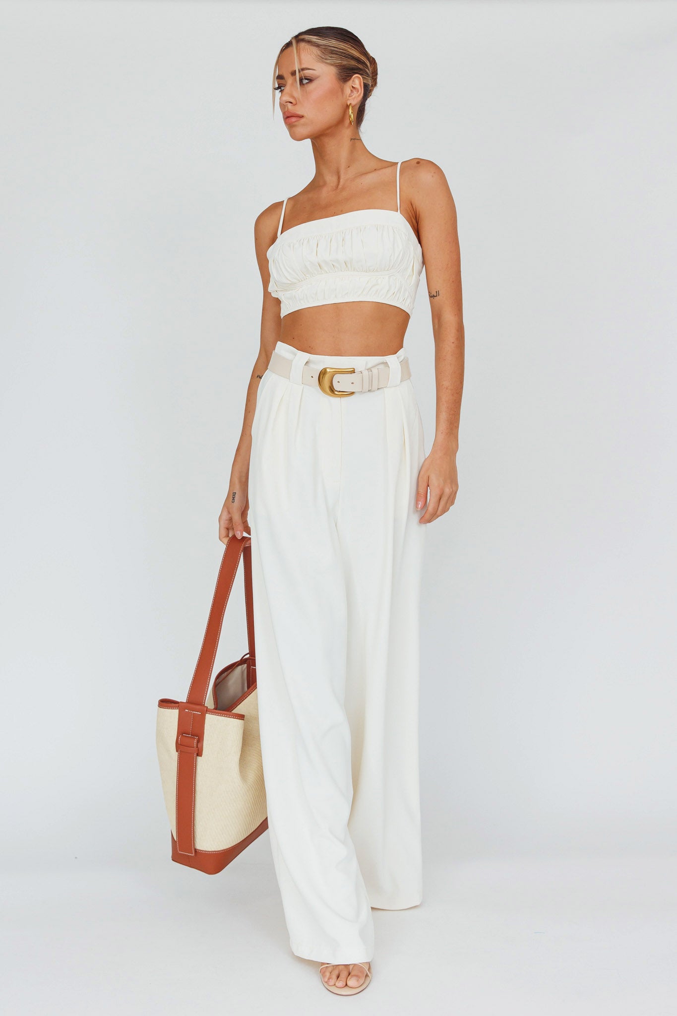 Steal the spotlight in our super cute Regal pants. We are obsessed with their on-trend wide-leg style. Perfect for a night out with the girls teamed with their matching crop top and tan mules.