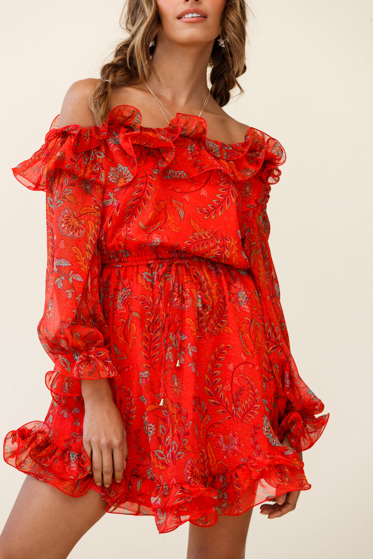 Turn heads in our super cute Rhiannon dress. Featuring an off-shoulder style with lettuce frill trim, long sleeves, elasticated waist with tie and the prettiest paisley-floral chiffon fabric. Perfect for brunch with your besties teamed with your favorite mules and tote.