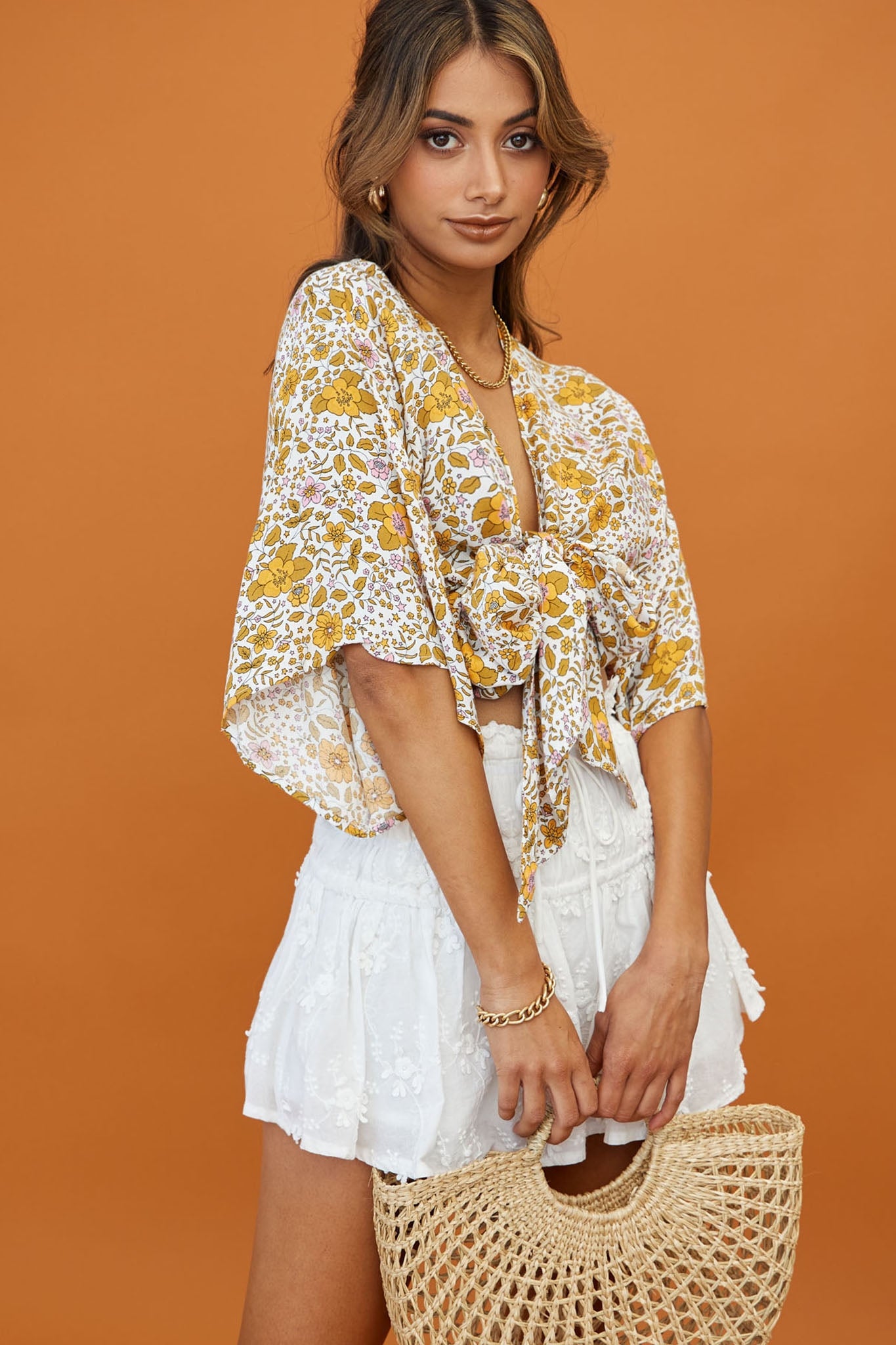 We are in love with this playful crop top featuring on-trend bell sleeves, deep neckline and gorgeous floral print fabric. Wear it to happy hour with the girls or a swanky rooftop bar teamed with high-waisted jeans or our Remember Me skirt and gold hoop earrings. You'll steal the show!