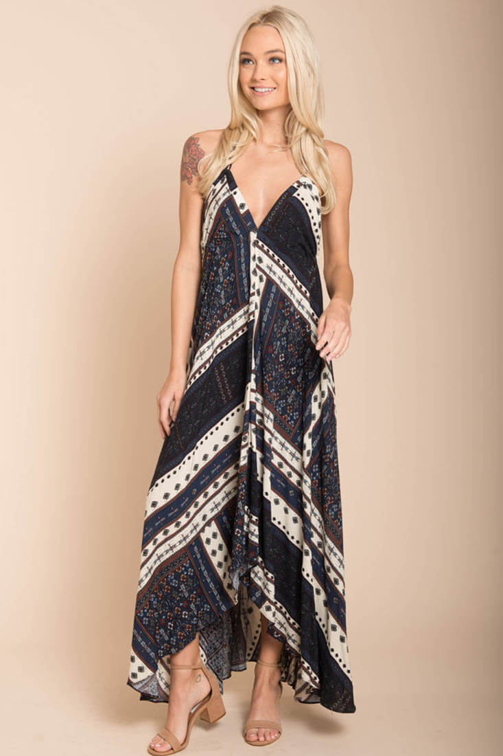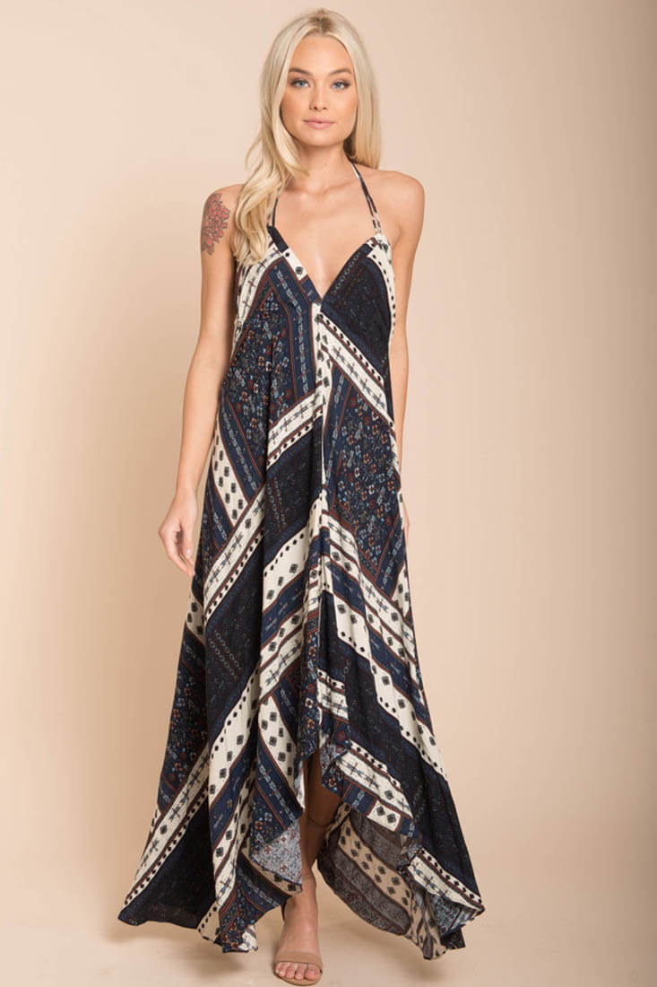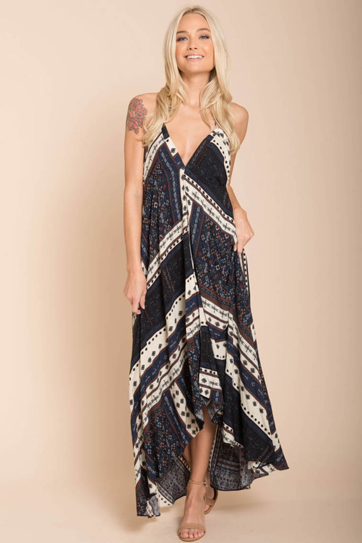 Send bohemian beach babe vibes no matter where you are in the Romani Fall Maxi dress. This dress captures the essence of wanderlust as the sun kisses your exposed back. Pair with open-toed flat sandals for your wondrous adventures.