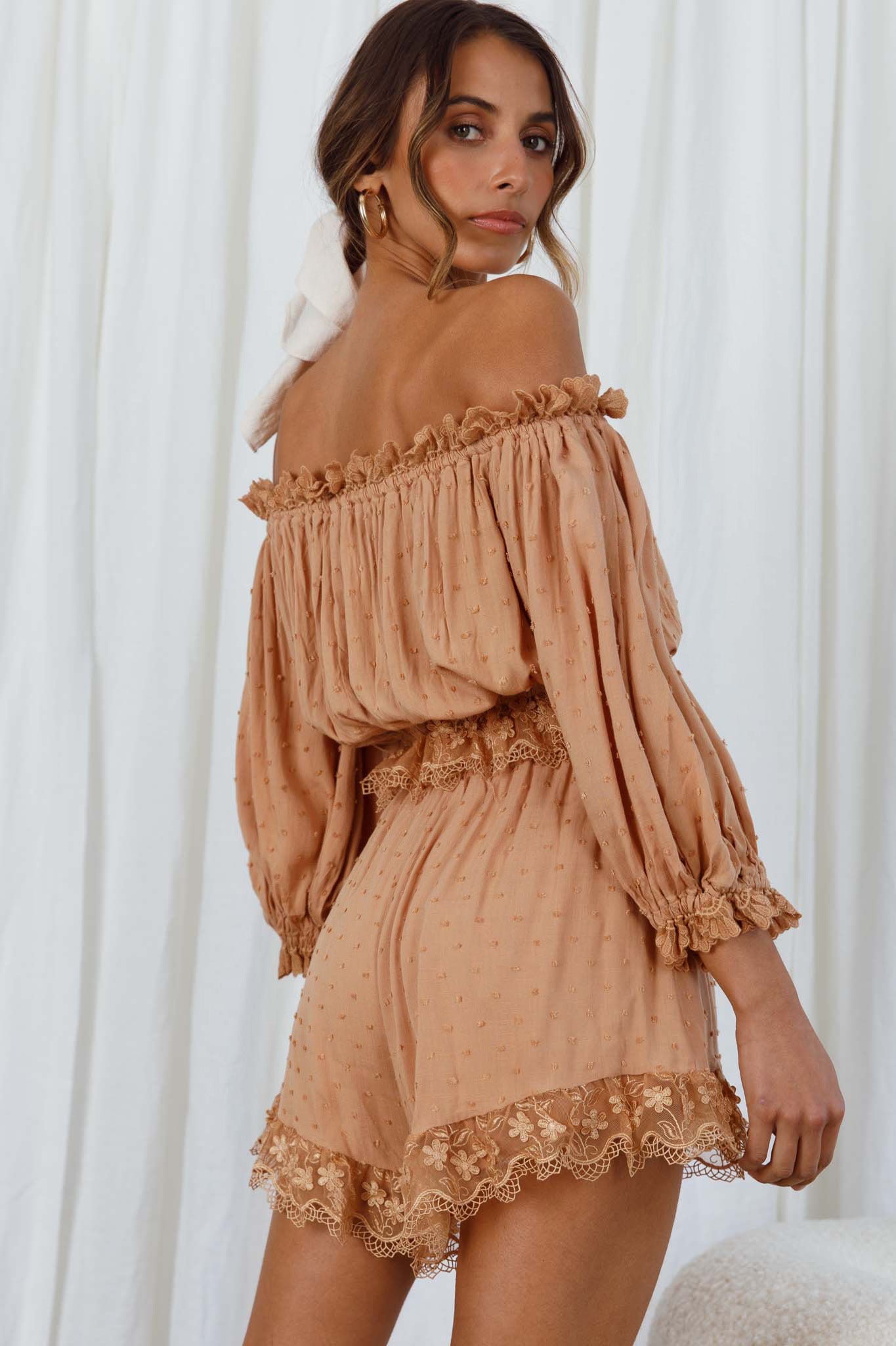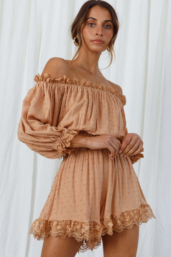 Romilly Scalloped Lace Trim Off-Shoulder Top Tan