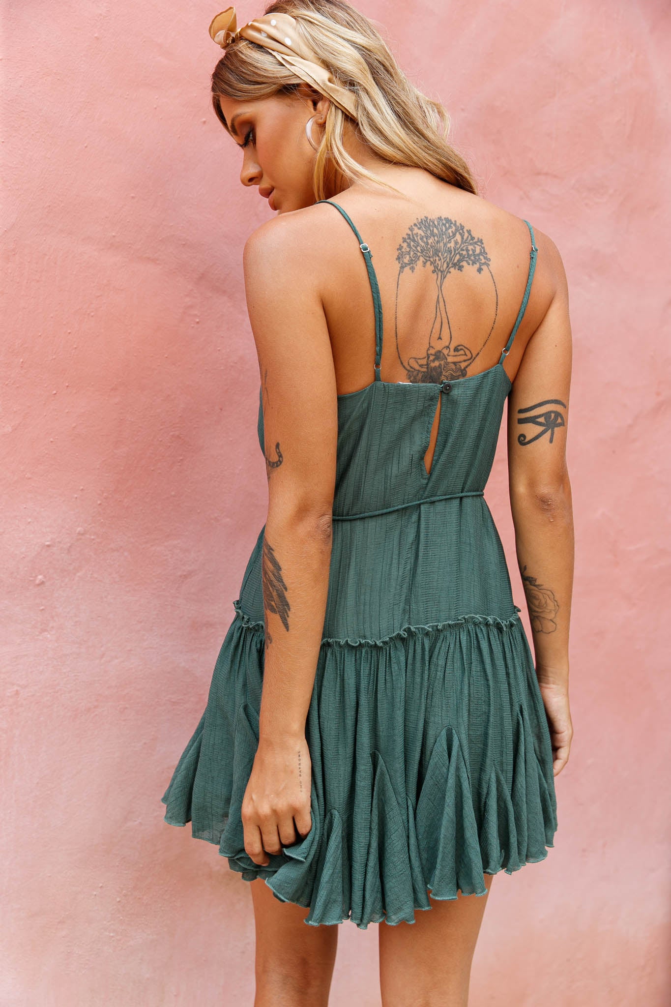 Rosabel Spaghetti Strap Fluted Hem Dress Green