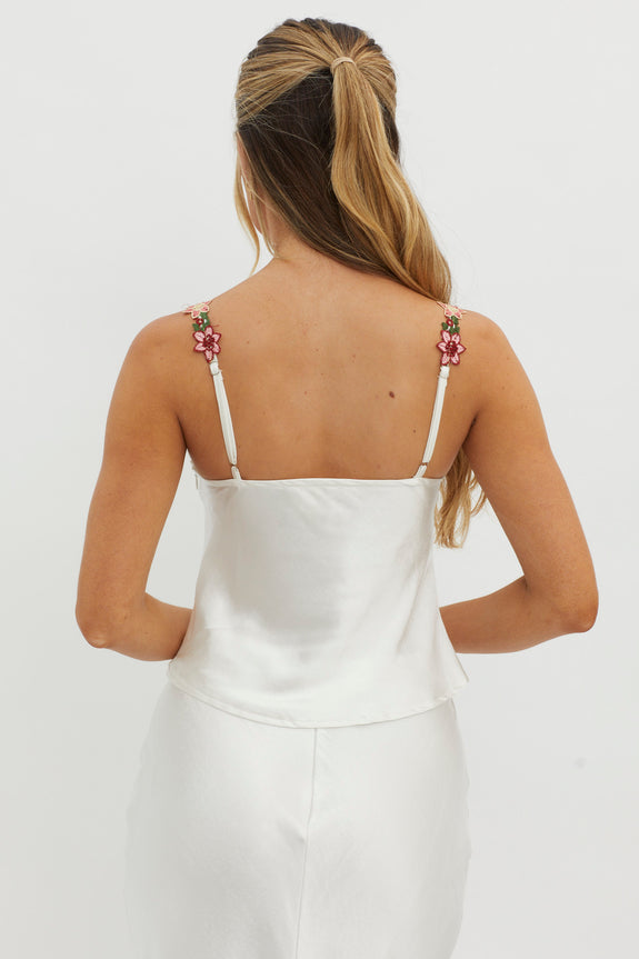Heads will turn when you walk by in our gorgeous Rose Garden cami top. We are in love with its pretty, floral applique trim! Perfect for a flirty first date teamed with its matching skirt and strappy, nude heels for a romantic look we are loving.