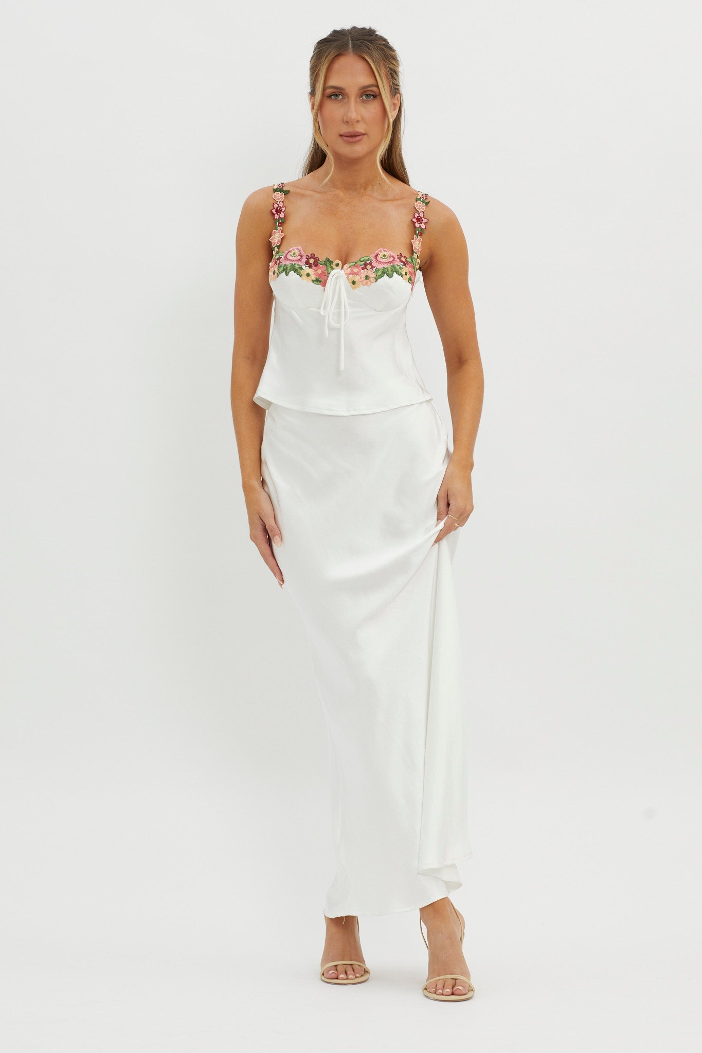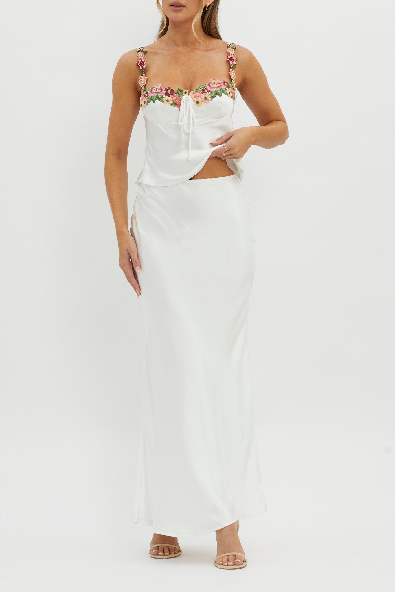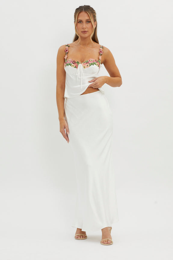 Heads will turn when you walk by in our gorgeous Rose Garden maxi skirt. We are in love with its soft satin fabric that floats with you as you walk. Perfect for a flirty first date teamed with its matching cami top and strappy, nude heels for a romantic look we are loving.