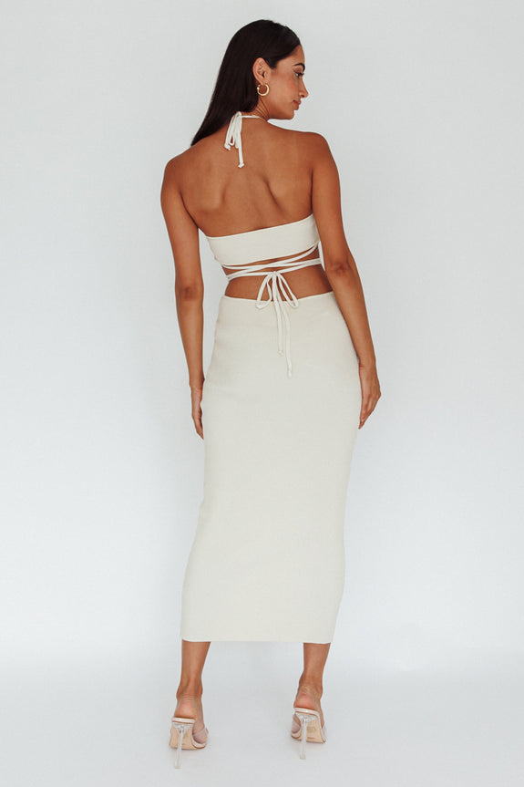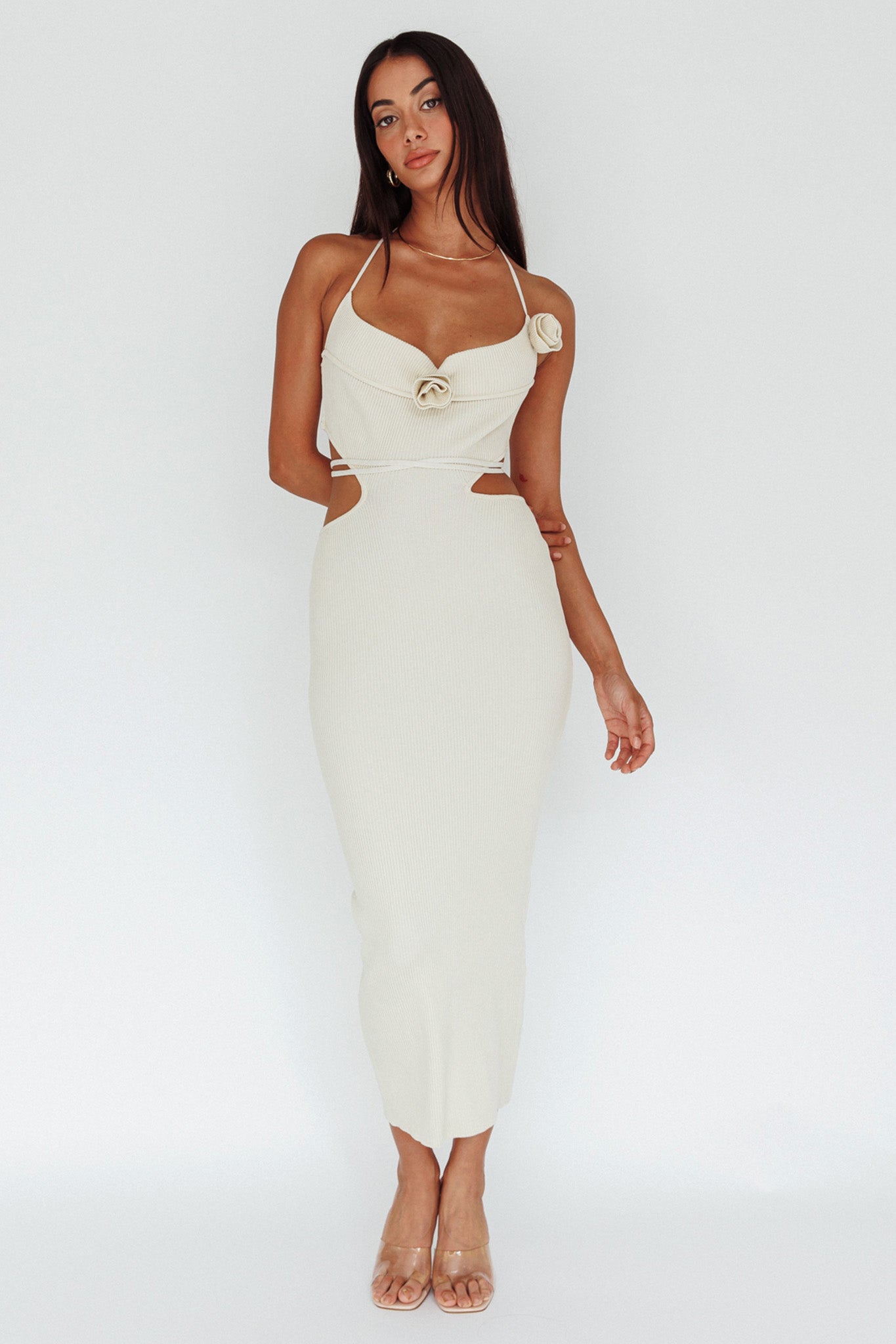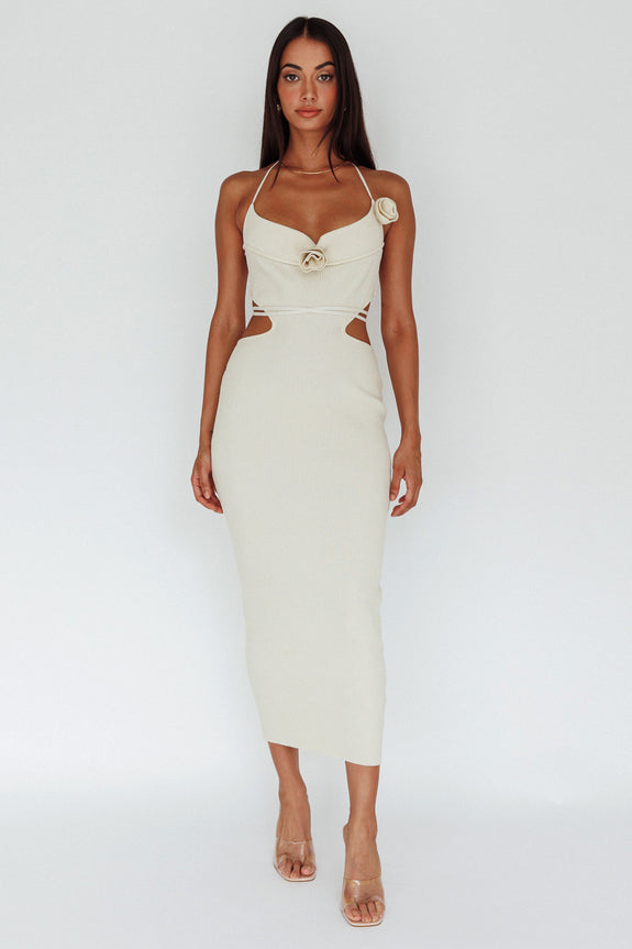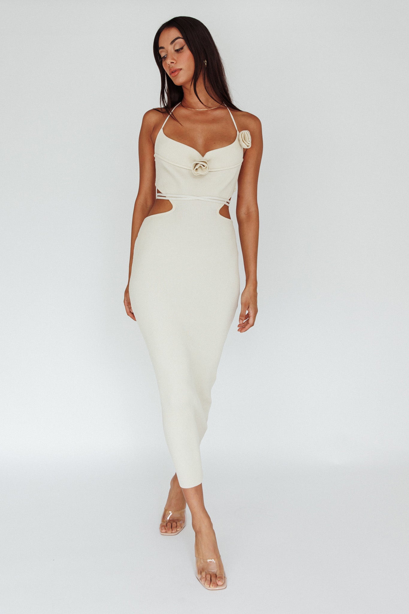 Rue Rose Accent Ribbed Knit Midi Dress Beige