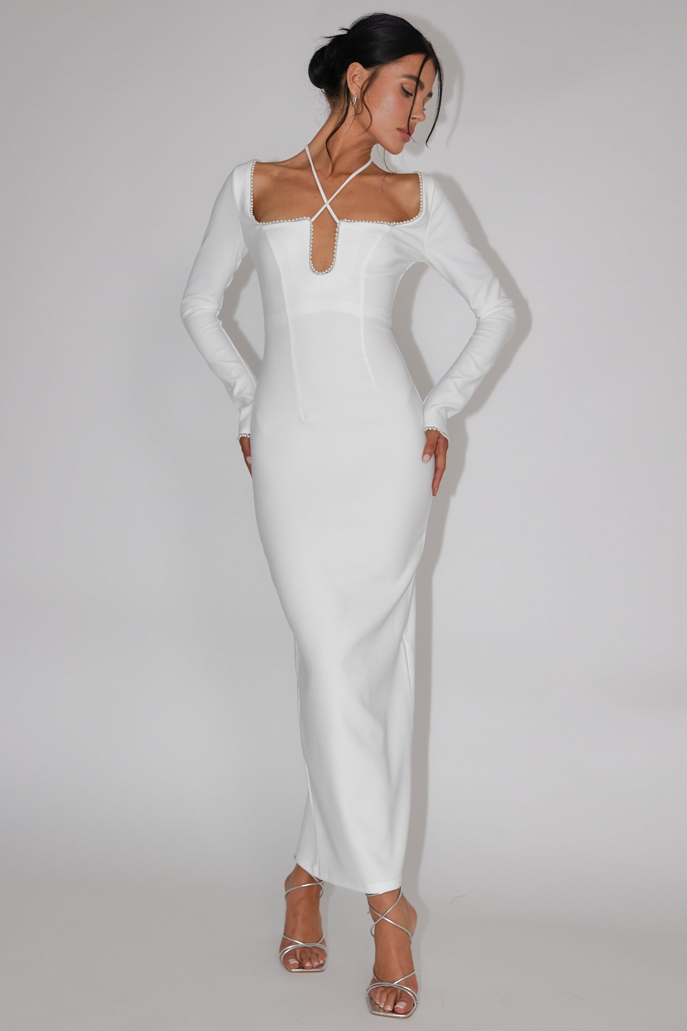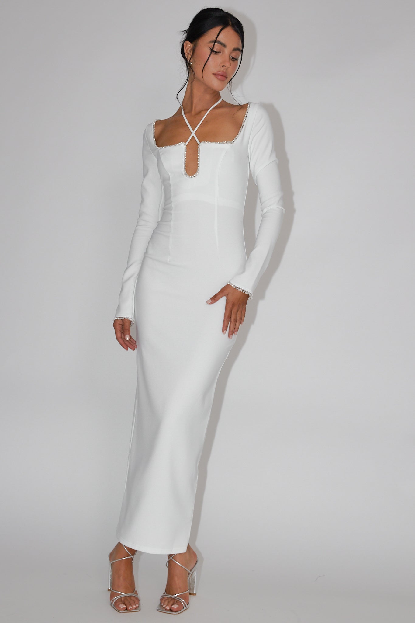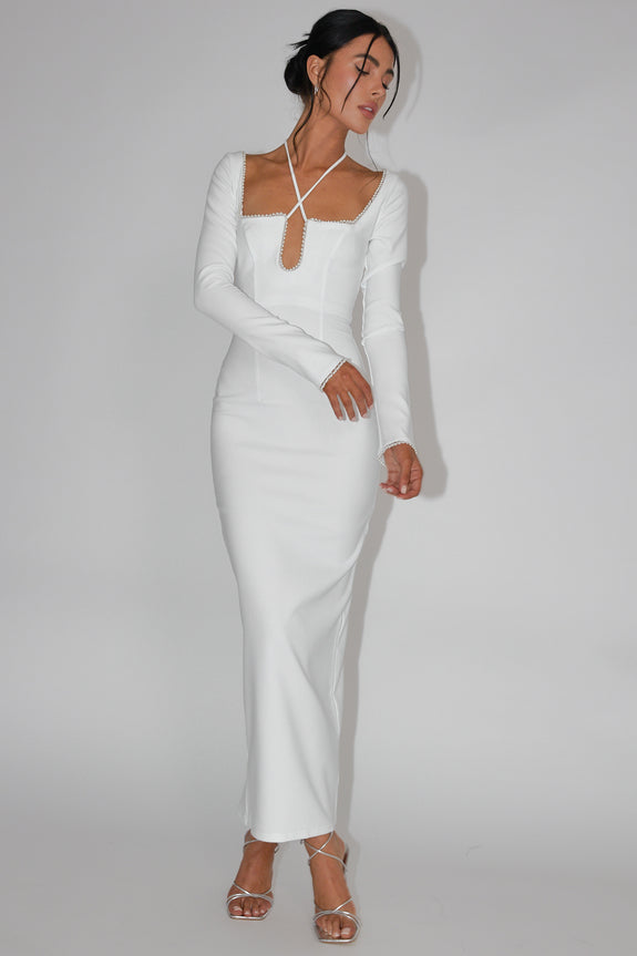Steal the spotlight in our Samantha Midi Dress! Perfect for a special occasion, we are obsessed with its pearl detail in the neckline and cuffs. Style yours with heels and a clutch for all the attention.
