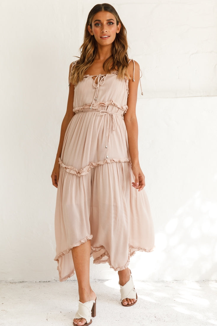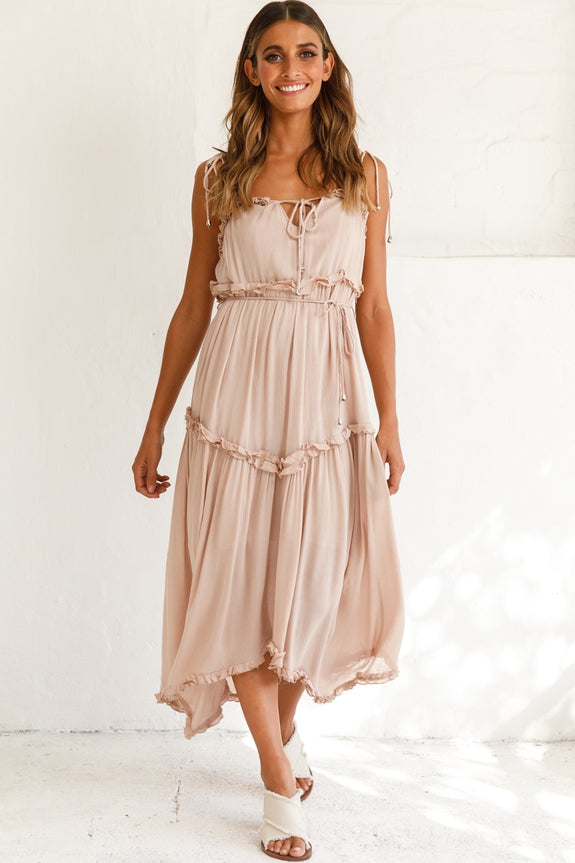 You'll feel like taking the day off work and escaping for a day of sun and fun in our Santa Monica maxi dress. Fully lined, it features double string-tie shoulder straps with golden toggles, frill details, a fluted hem and separate string tie around the waist. Team it with a straw hat and sandals for a fun look we are loving.