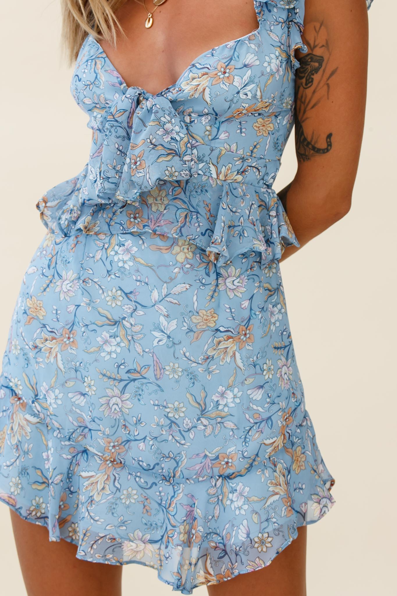 Say That Again Bust Tie Ruffle Trim Dress Floral Print Blue